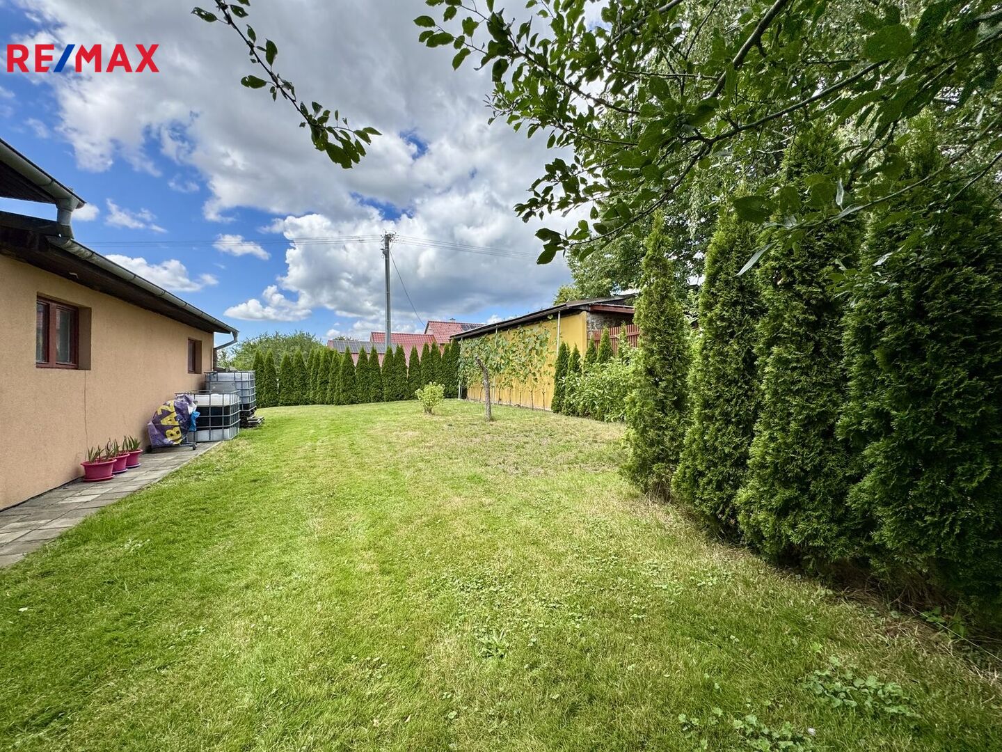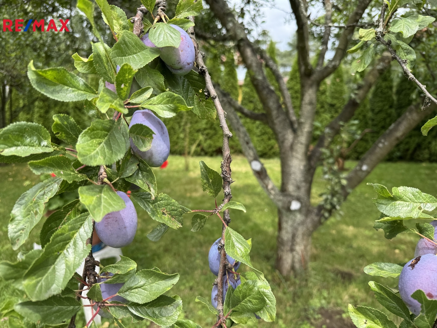 Na zahradě jsou vzrostlé a rodící ovocné stromy – ryngle, švestky, třešeň.