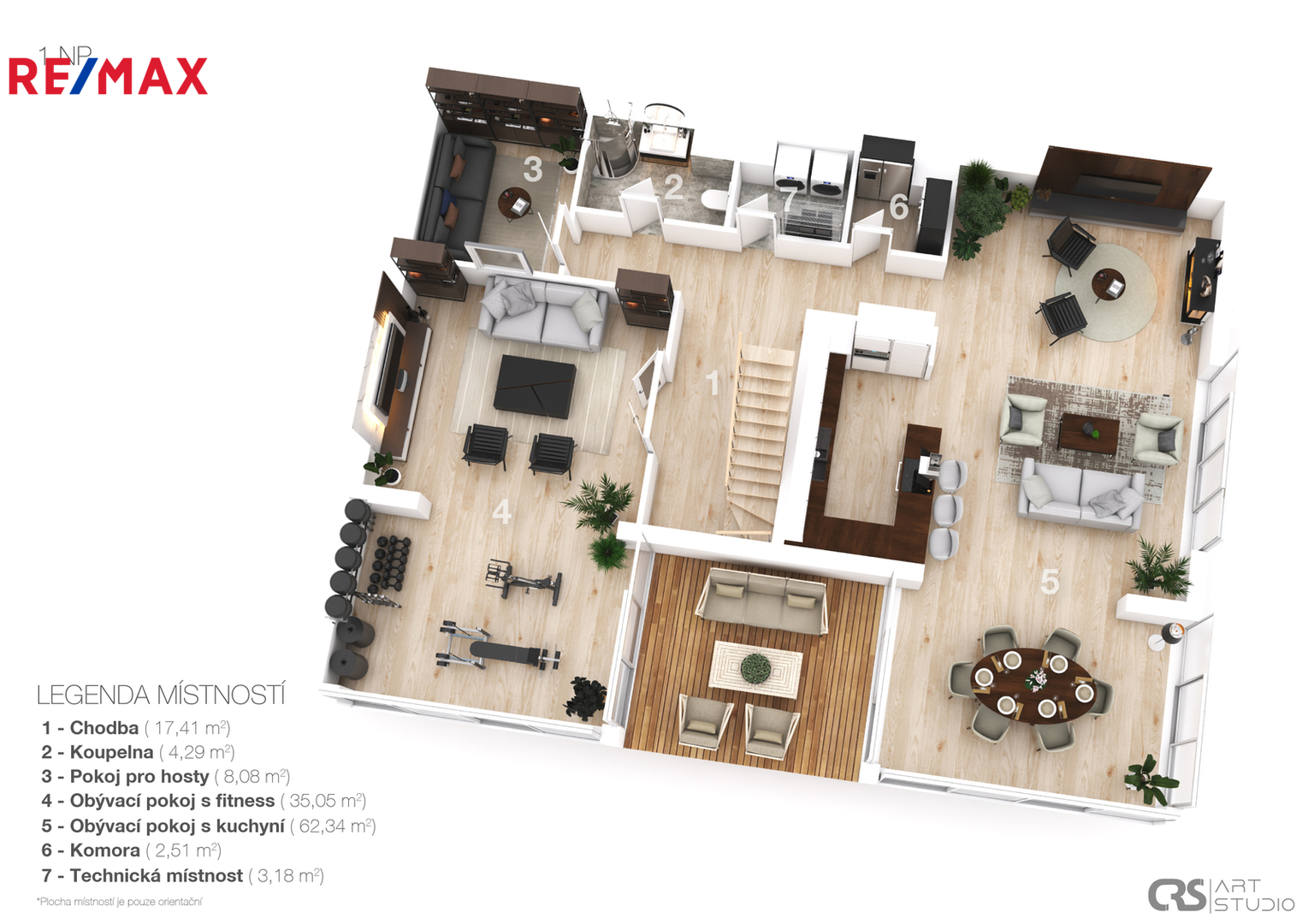 Vedle obývací části se nachází další prostorný pokoj, který současní majitelé využívají jako tělocvičnu; za ní se pak nachází pokoj pro hosty.