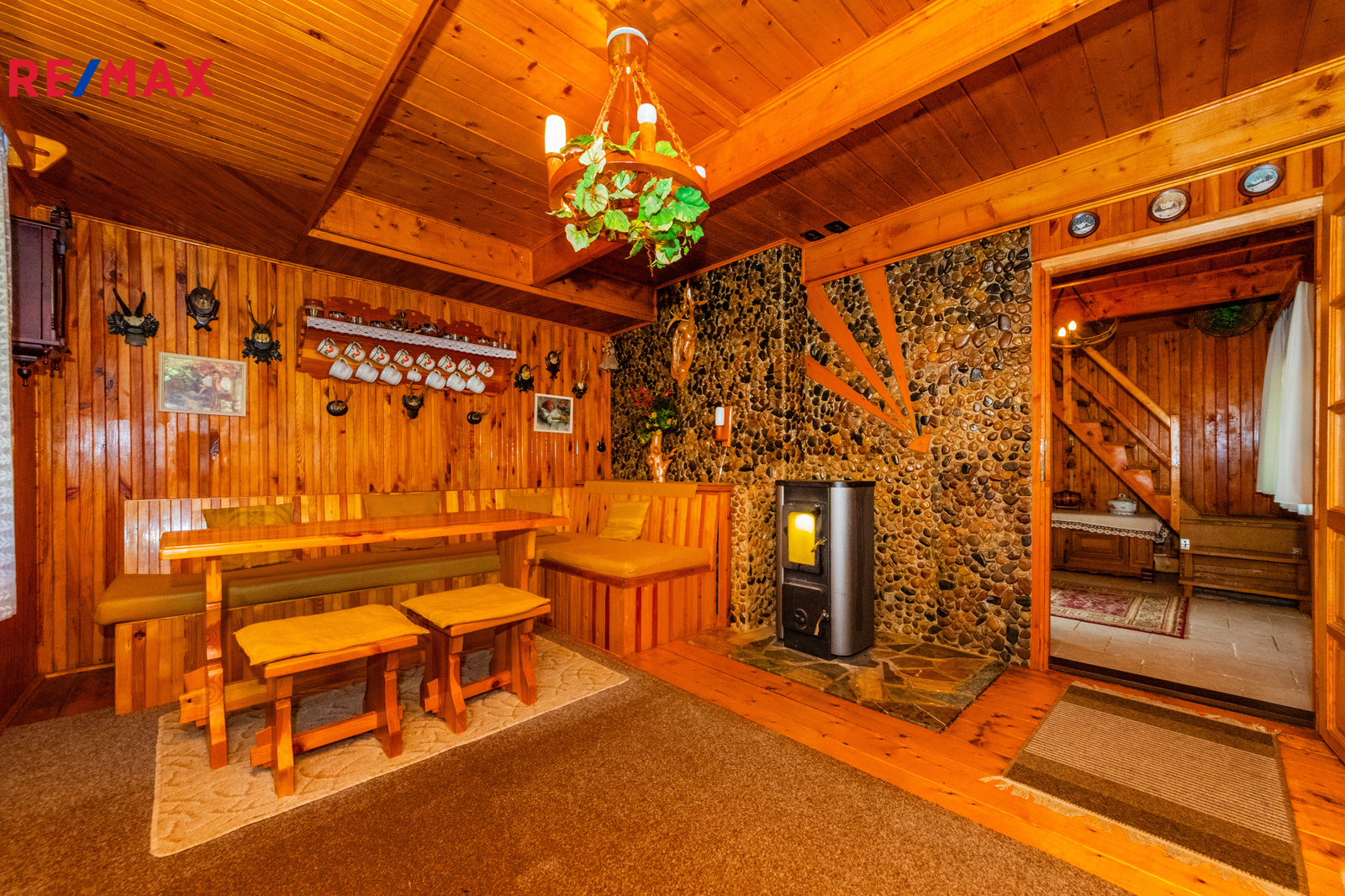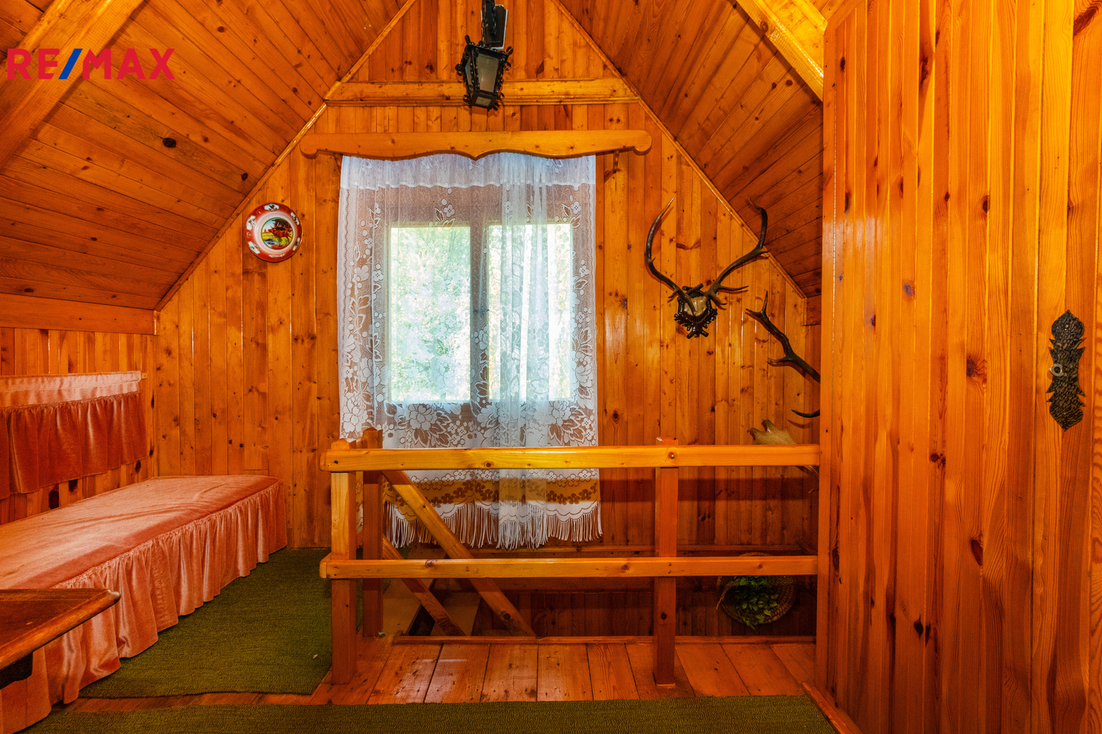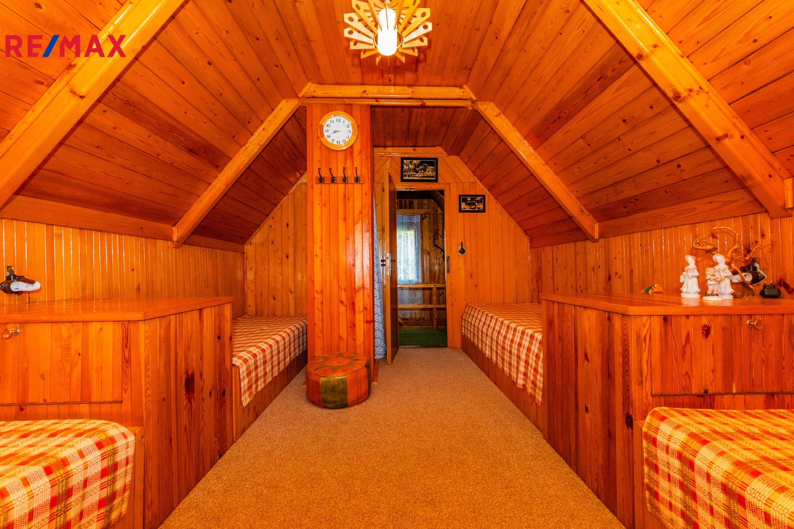 V přízemí využijete obývací pokoj (16 m²), kuchyni (4 m²), komoru (1,20 m²) a předsíň se schodištěm (8,32 m²). Po dřevěných schodech vystoupáte do patra, kde je k dispozici ložnice (15,80 m²) s balkonem (2,60 m²) a výstup do podkroví (7,35 m²). Ve zděném suterénu je umístěna uzamykatelná garáž (24,60 m²) s malou dílničkou a koupelnou se sprchovým koutem. Dále je k dispozici samostatný sklep (3,68 m²) a samostatná toaleta (1 m²). Strávíte tu krásný večery s kytarou u ohniště. Využijete taky vlastní vrtanou studnu s hloubkou 22 metrů.