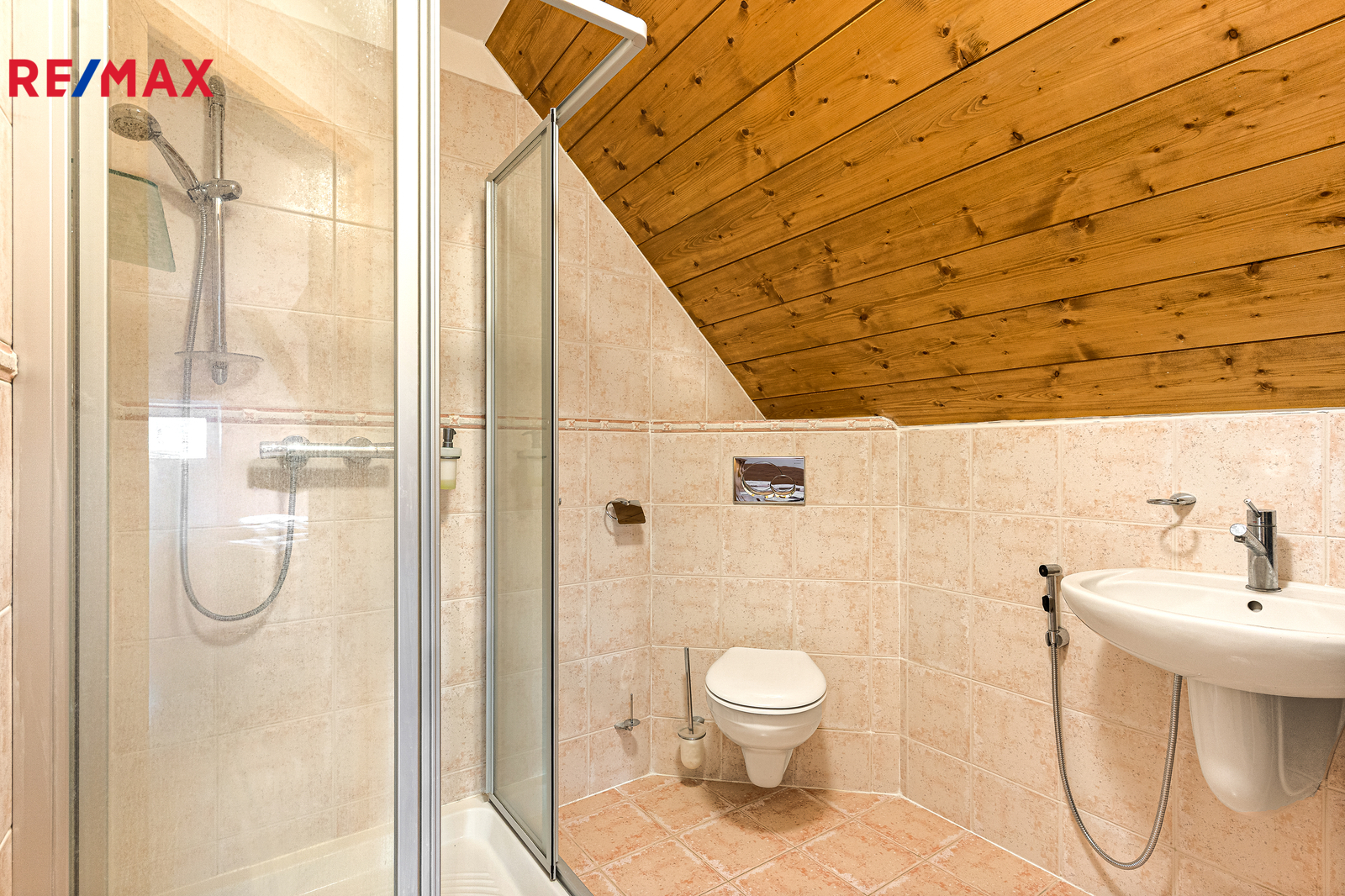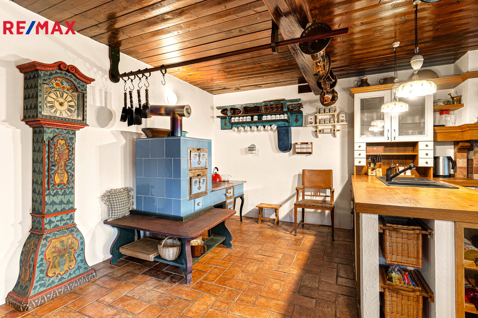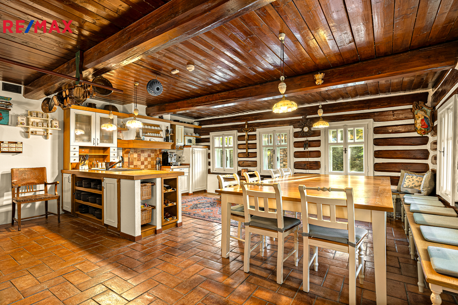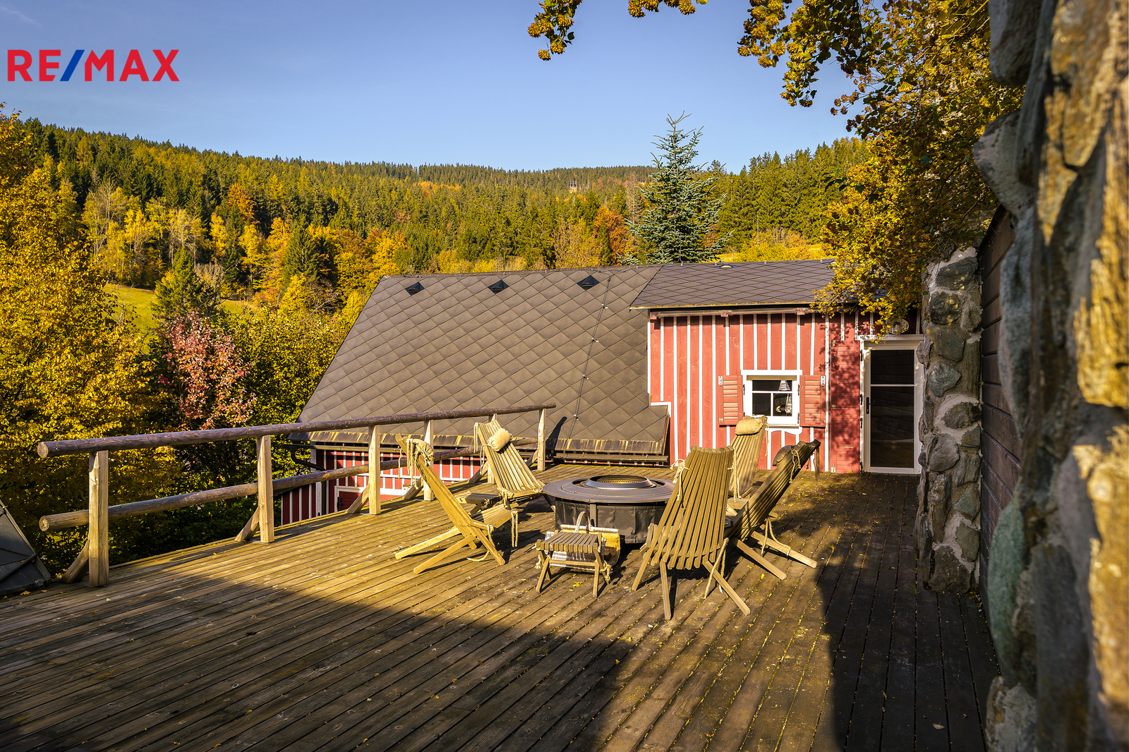 V přízemí se nachází prostorná, do detailu vybavená obytná kuchyně s jídelnou, ideální pro velké rodinné setkání či přátelské posezení. Atmosféru dotváří krásná kachlová kamna a stylová replika místních stojacích hodin s původním strojkem. Součástí přízemí je i odpočinková místnost, využitelná i jako ložnice s vlastní koupelnou vybavenou špičkovou saunou KLAFS (finská sauna, saunarium, infrasauna) a parní sprchou KERAMAG AURA. Samozřejmostí je i samostatné WC. V zadní části domu se nachází moderní kotelna a původní kamenný sklep s celoroční stálou teplotou. Dispozici přízemí dále tvoří místnost s výjimečným atraktivním prvkem - přiznanou skalní stěnou, po níž jemně stékají pramínky vody. Další místnost, která je vybavená barem a elektrickým krbem zn. ELEMENT, tvoří společenskou část chalupy a navazuje na ní kinosál vybavený technikou B&W. Z této místnosti je vstup na spodní venkovní terasu. Nad tímto křídlem se nacházejí dvě ložnice s vlastní koupelnou a jedna je se vstupem na druhou vyvýšenou venkovní terasu, která je vybavená stylovým nábytkem EcoFurn, Solo Stove.