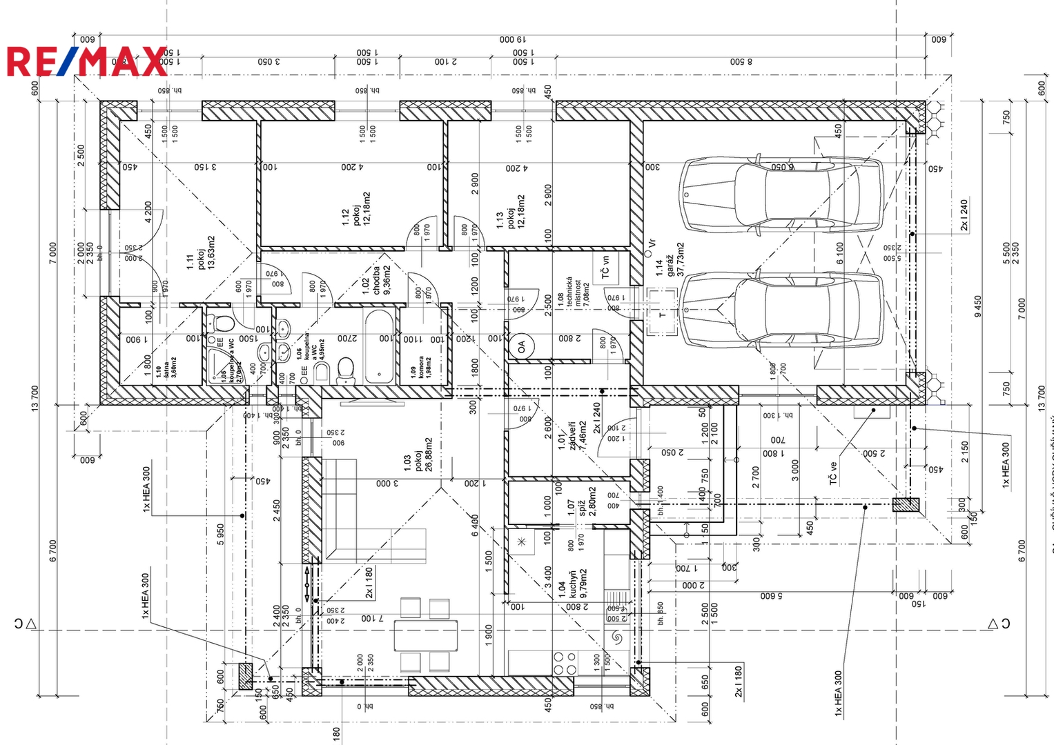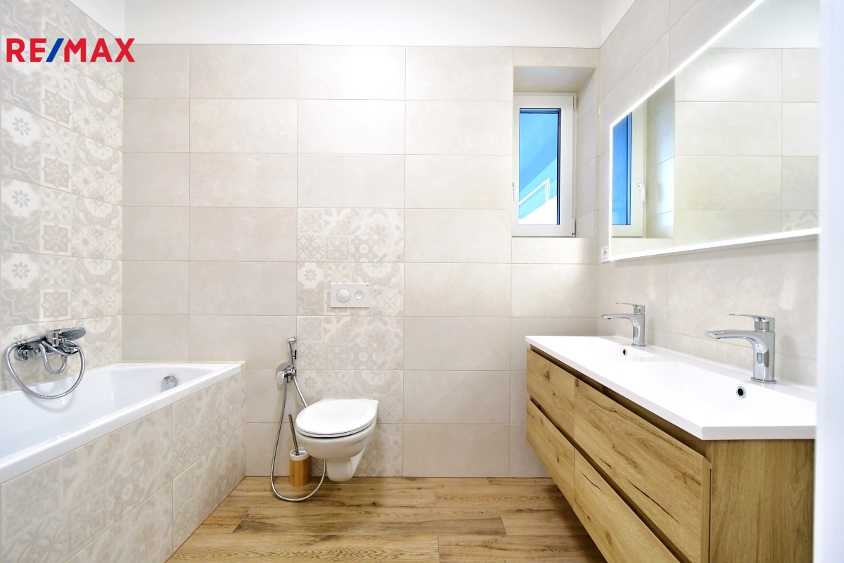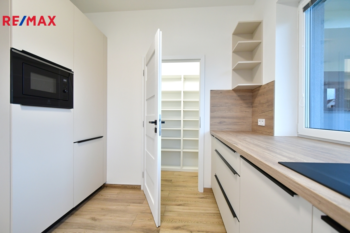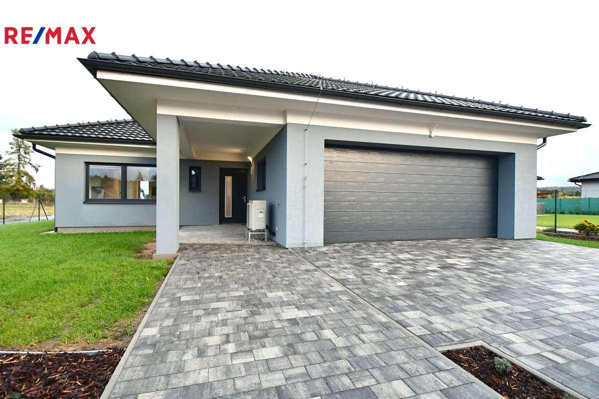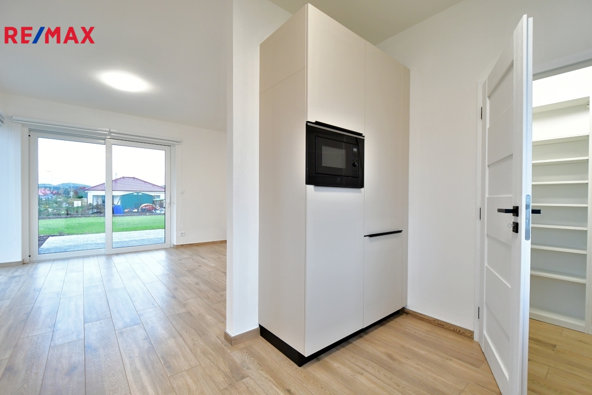 Elegantně řešený RD (114, 59 m2) disponuje 3 ložnicemi, obývacím pokojem s kuchyňským koutem a spižírnou, dvěma koupelnami, šatnou, technickou místností, zádveřím s vestavěnými skříněmi a garáží (37,73 m2) pro 2 osobní auta.
