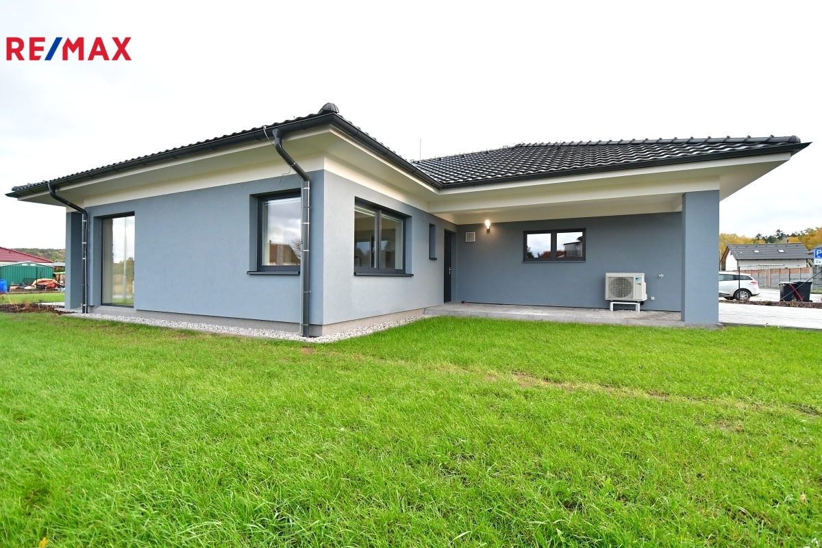 Zahrada domu (673 m2) je nově založená a kromě trávníku zde časem vyrostou i příjemné keře vizuálně oddělující zahradu od okolních pozemků.