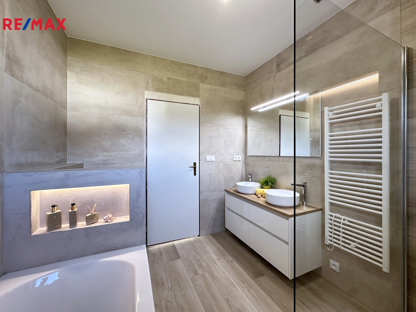moderní koupelna s velkoformátovými obklady, walk-in sprchou a LED podsvícenou nikou