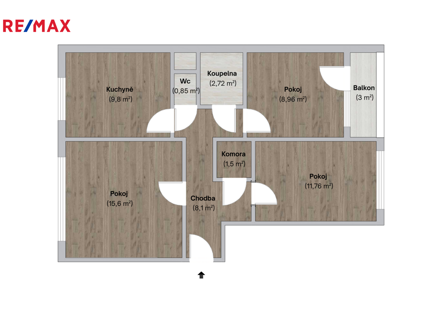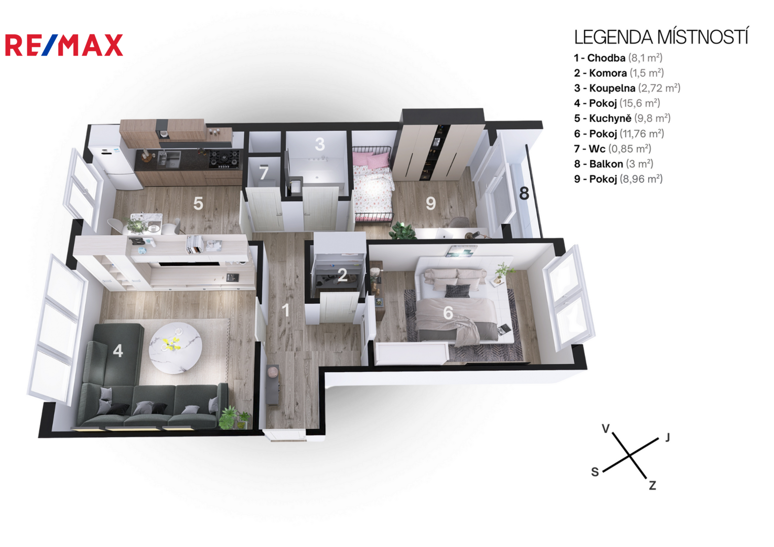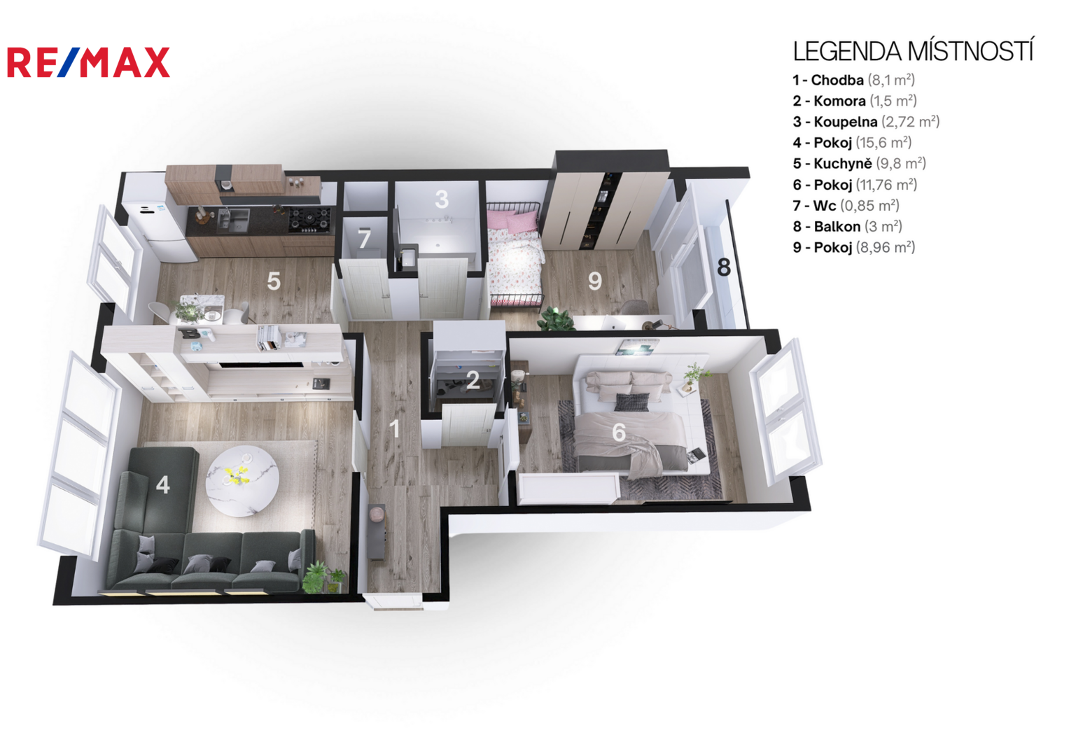 Dispozice bytu je velmi praktická – obývací pokoj má 15,6 m², pokoj 11,76 m², ložnice 8,96 m², kuchyň 9,8 m², chodba 8,1 m², koupelna 2,72 m², WC 0,85 m² a komora 1,5 m². Byt je osobitý, pečlivě udržovaný a plně vybavený, připravený k okamžitému nastěhování, případně dle dohody. Díky své dispozici nabízí dostatek soukromí, světla i úložného prostoru.