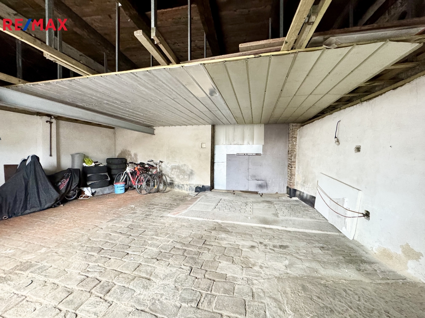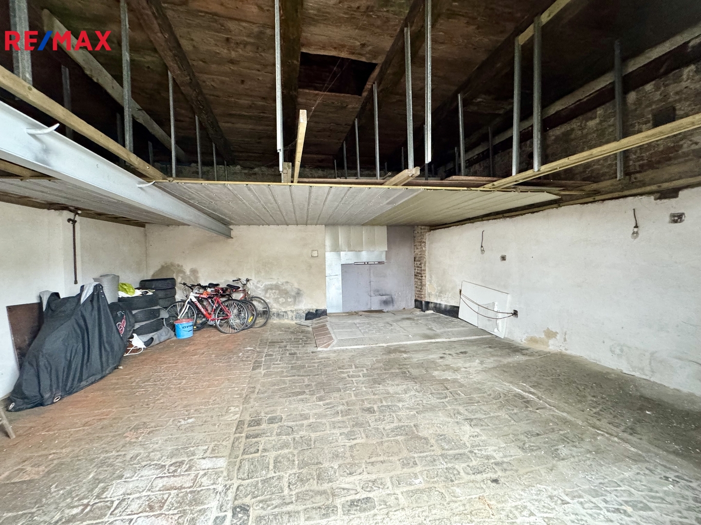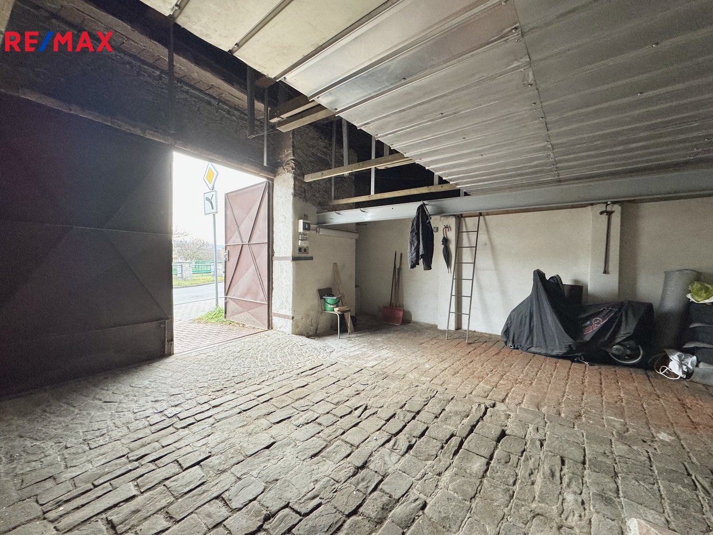 Garáž má 38 m2 a je přístupná do půdního prostoru a podkroví (výška vjezdu 2,40, šířka vjezdu 2,40, délka 5,50 m, šířka 6,90 m). Vrata plechová. Elektrická přípojka je v prostřední garáži a je možné se připojit. Volná ihned.