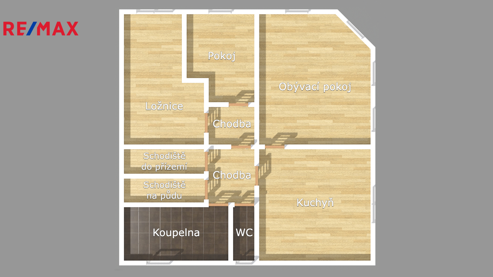 V prvním patře se nachází zrekonstruovaná bytová jednotka o dispozici 3+1. Světlá kuchyně s moderní linkou a spotřebiči (stáří 1 rok) navazuje na prostorný obývací pokoj. Dvě ložnice a koupelna s rohovou vanou a WC doplňují komfortní bydlení v klidném prostředí centra městyse.