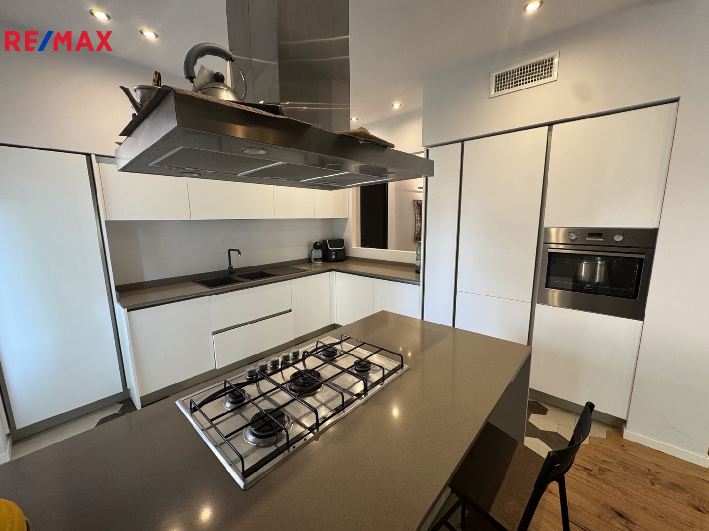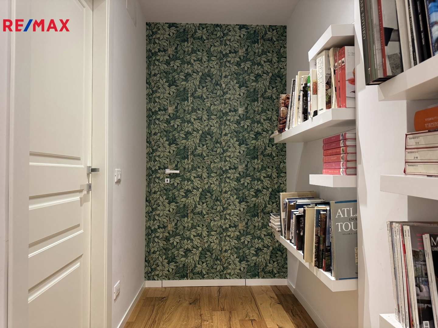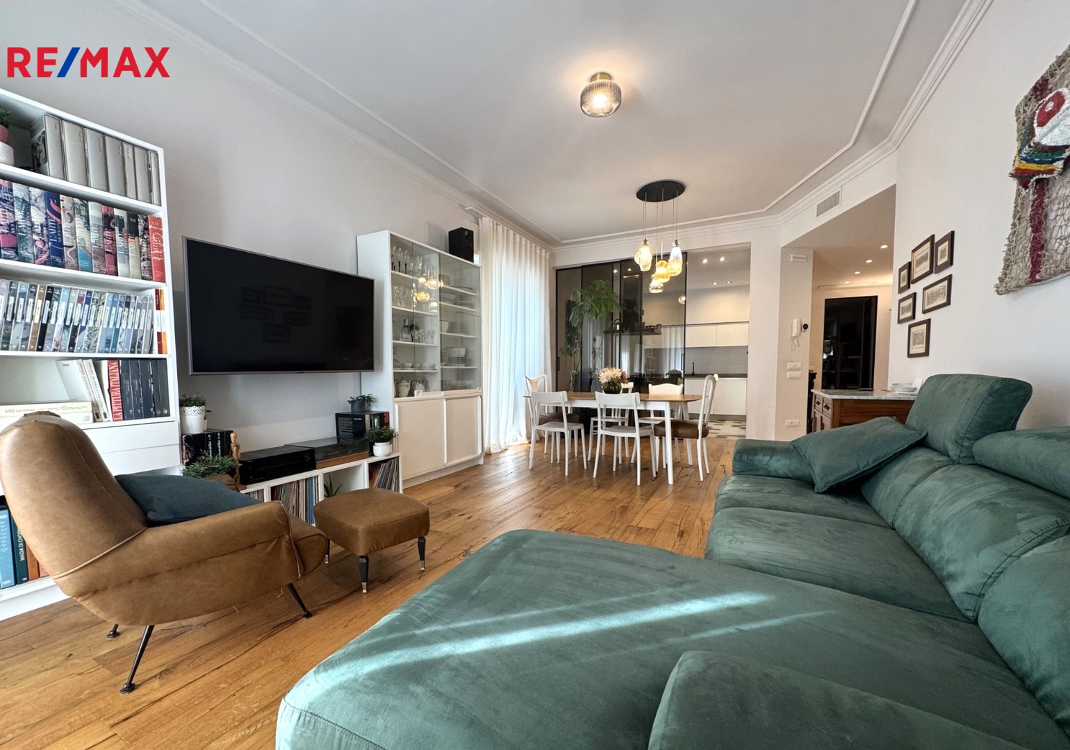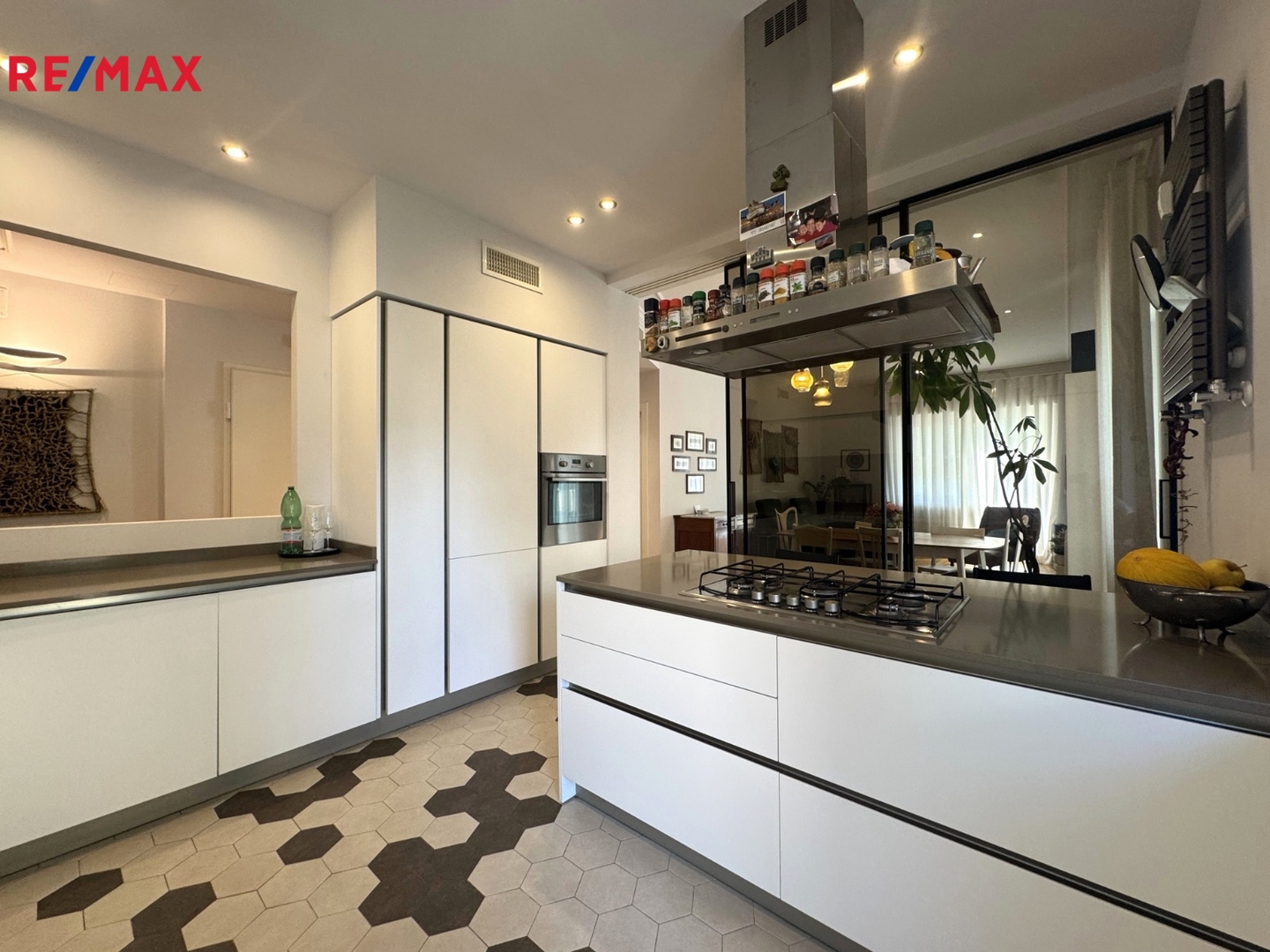 Tento elegantní byt o dispozici 5+kk se nachází ve čtvrtém patře udržovaného domu s výtahem. Prošel kompletní a vkusnou rekonstrukcí, při níž byly použity kvalitní materiály a prvotřídní povrchové úpravy. Dispozice nabízí vstupní halu, prostorný obývací pokoj, samostatnou kuchyni s jídelním koutem a posuvnými dveřmi z kouřového skla, dvě prostorné ložnice, pracovnu (možno využít jako další ložnici), praktickou prádelnu a dvě koupelny – z nichž jedna je součástí hlavní ložnice se soukromým vstupem. K bytu náleží také velký balkon 21 m2 s příjemným výhledem a sdílené parkovací místo, s možností převzetí pronájmu garáže. Celý byt je vybaven dřevěnými podlahami a všechny místnosti jsou klimatizovány vzduchotechnikou pro maximální komfort během horkých letních dnů.