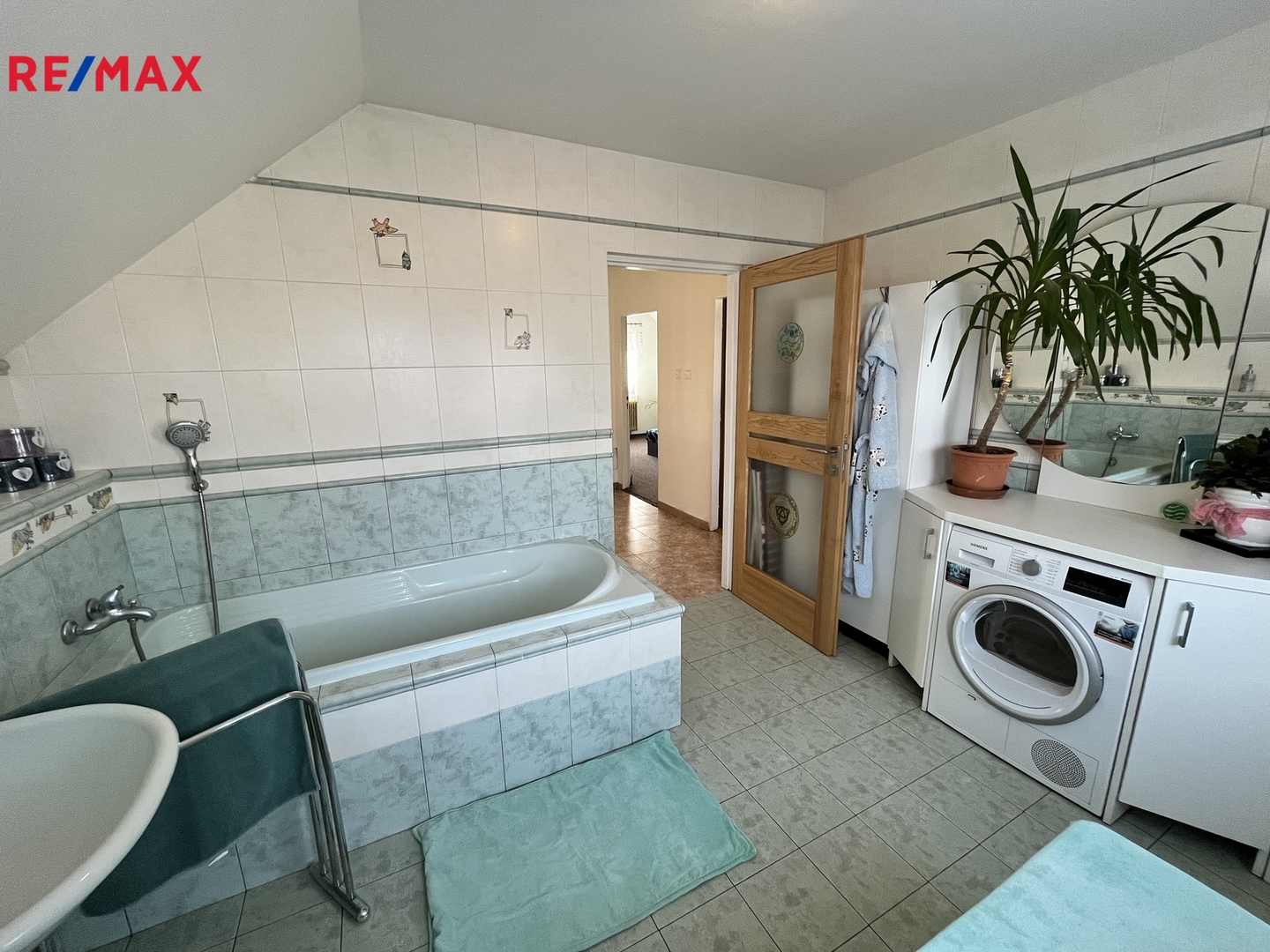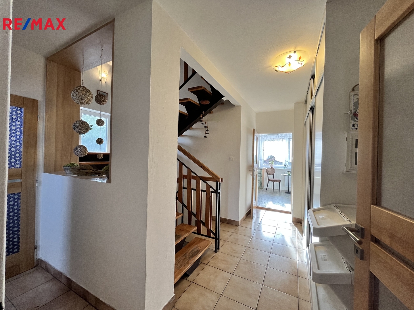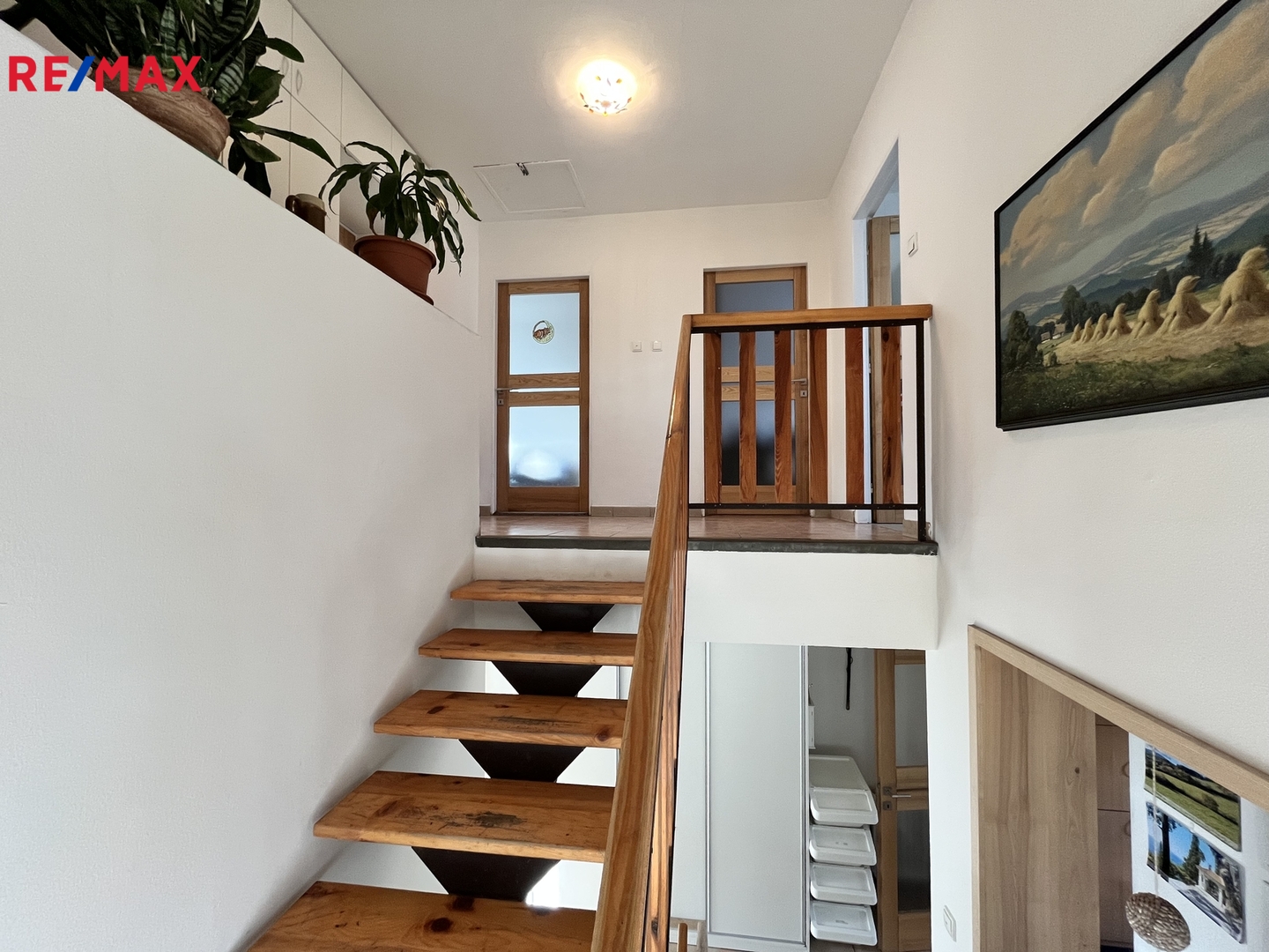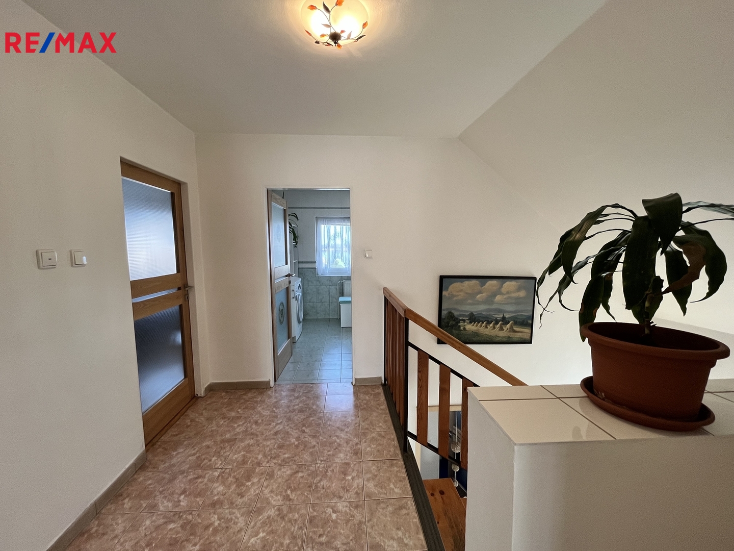 Dům tvoří dvě nadzemní podlaží a prostorný sklep s garáží. V přízemí najdete světlý obývací pokoj, kuchyň se spíží, koupelnu se sprchovým koutem a samostatné WC. V patře se nachází tři pokoje a druhá koupelna s vanou a WC. Ve sklepě je prostorná garáž s dílnou, kotel, bojler a velké množství úložného prostoru. Ze sklepa se dostanete dveřmi na zahradu.