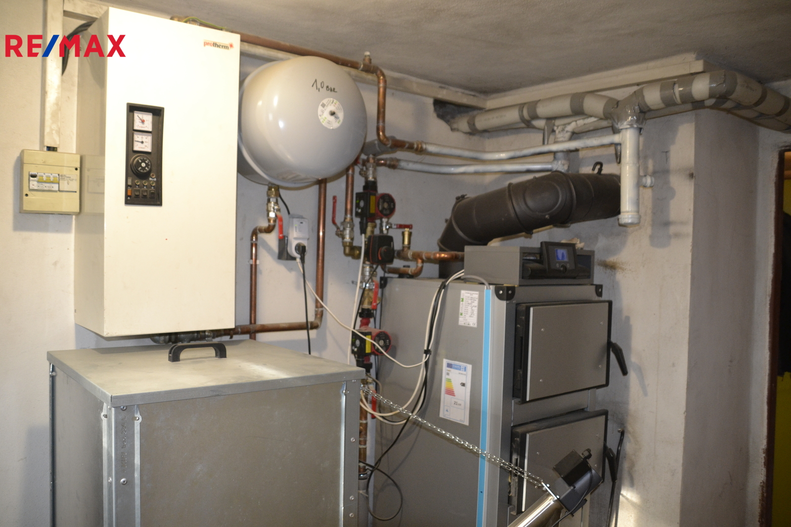 Celý dům je vytápěn kotlem na pelety se zásobníkem. V domě jsou rozvedeny radiátory. Druhou alternativou vytápění je elektrický kotel. V obývacím pokoji je k dispozici krb na dřevo. Teplou vodu zajištuje elektrický bojler. V tuto chvíli se využívá internet přes telefon od O2.