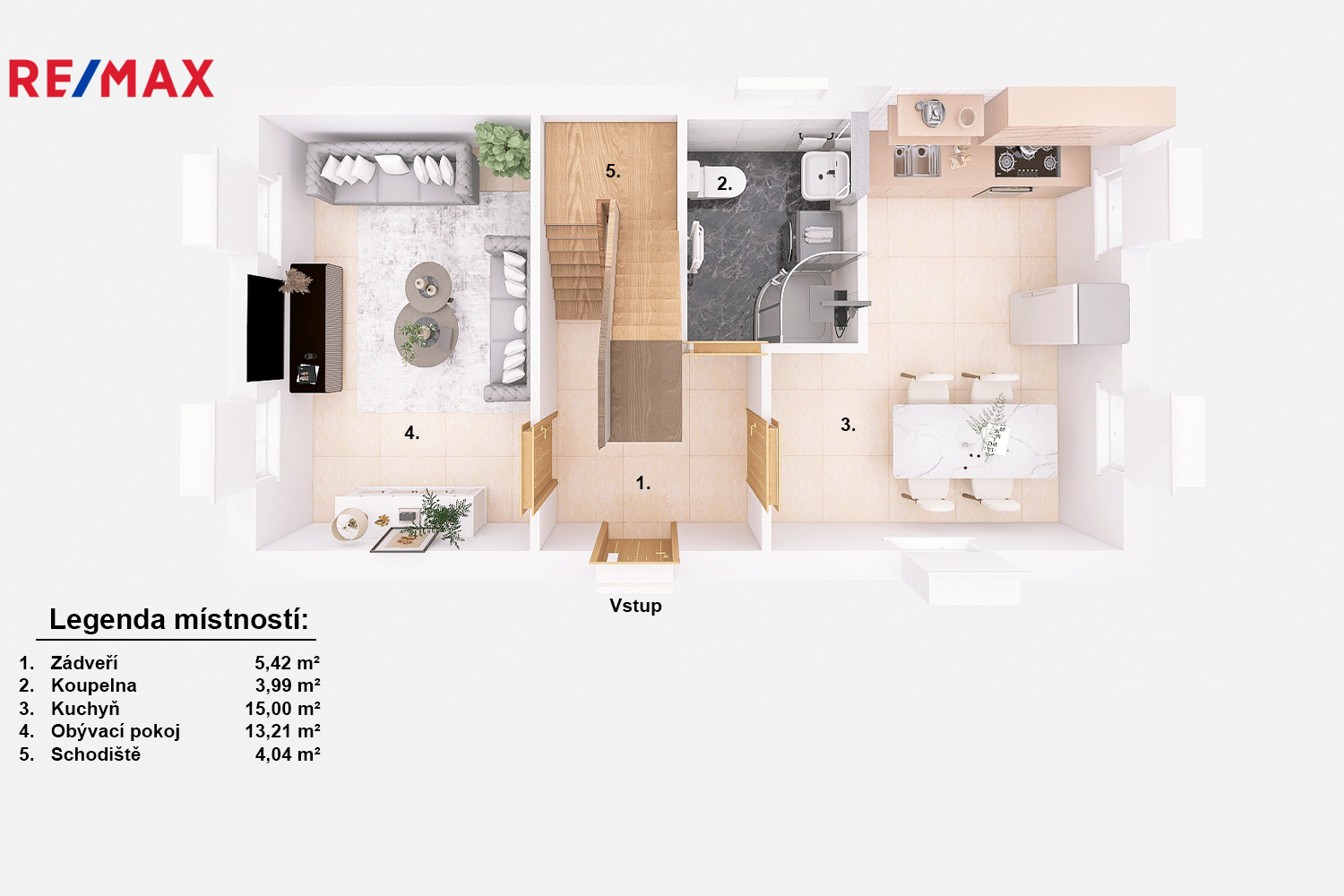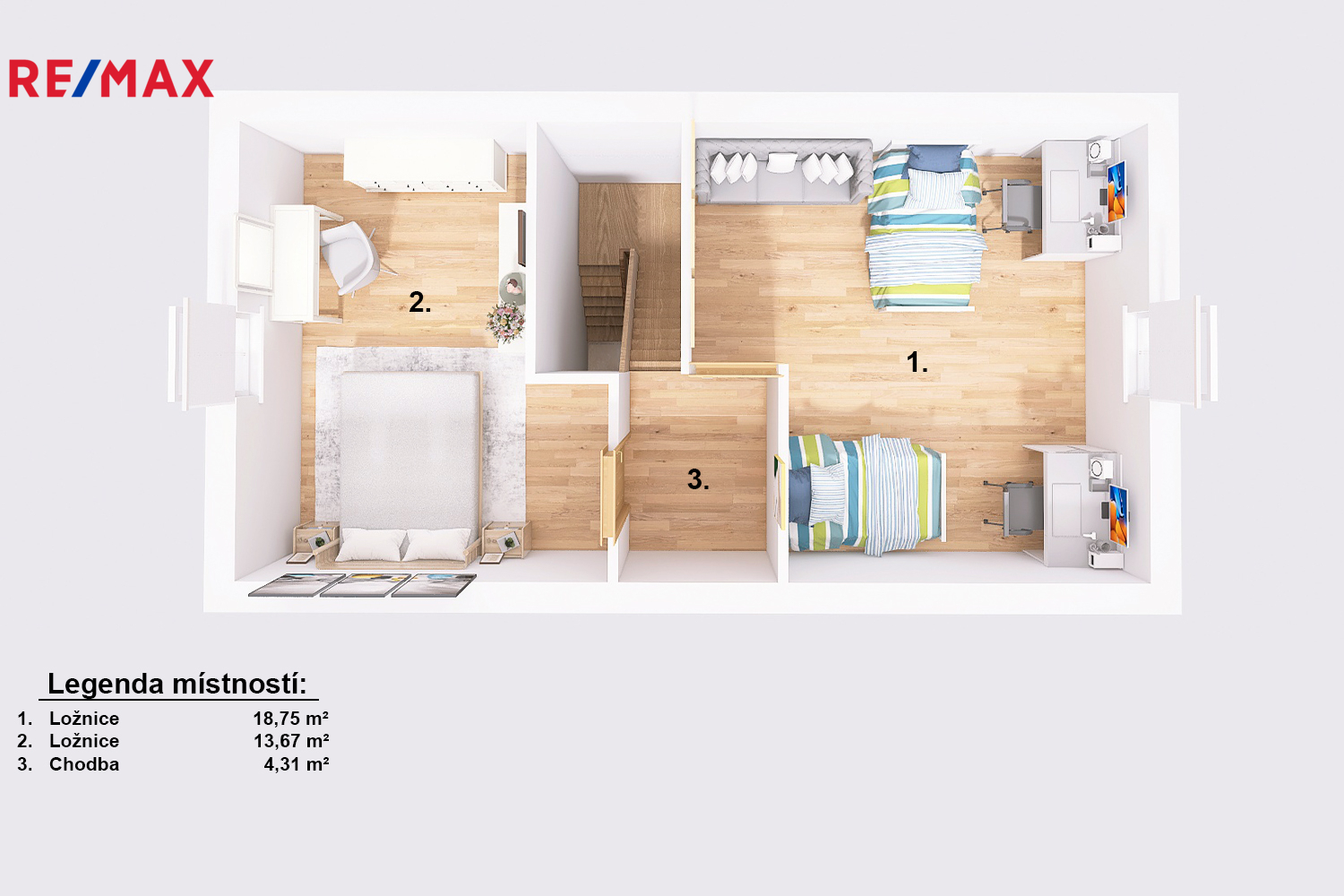 V přízemí na Vás čeká útulná kuchyně s krbovými kamny s výměníkem, které v zimě vykouzlí domovskou atmosféru i teplo poctivého ohně. Dále tu najdete koupelnu, obývací pokoj a praktický prostor pod schody ideální pro uložení věcí, které chcete mít po ruce. Z obývacího pokoje vede cesta do patra se dvěma samostatnými ložnicemi – klidnými, příjemnými a s vůní dřeva, která ke stylu chaty jednoduše patří.