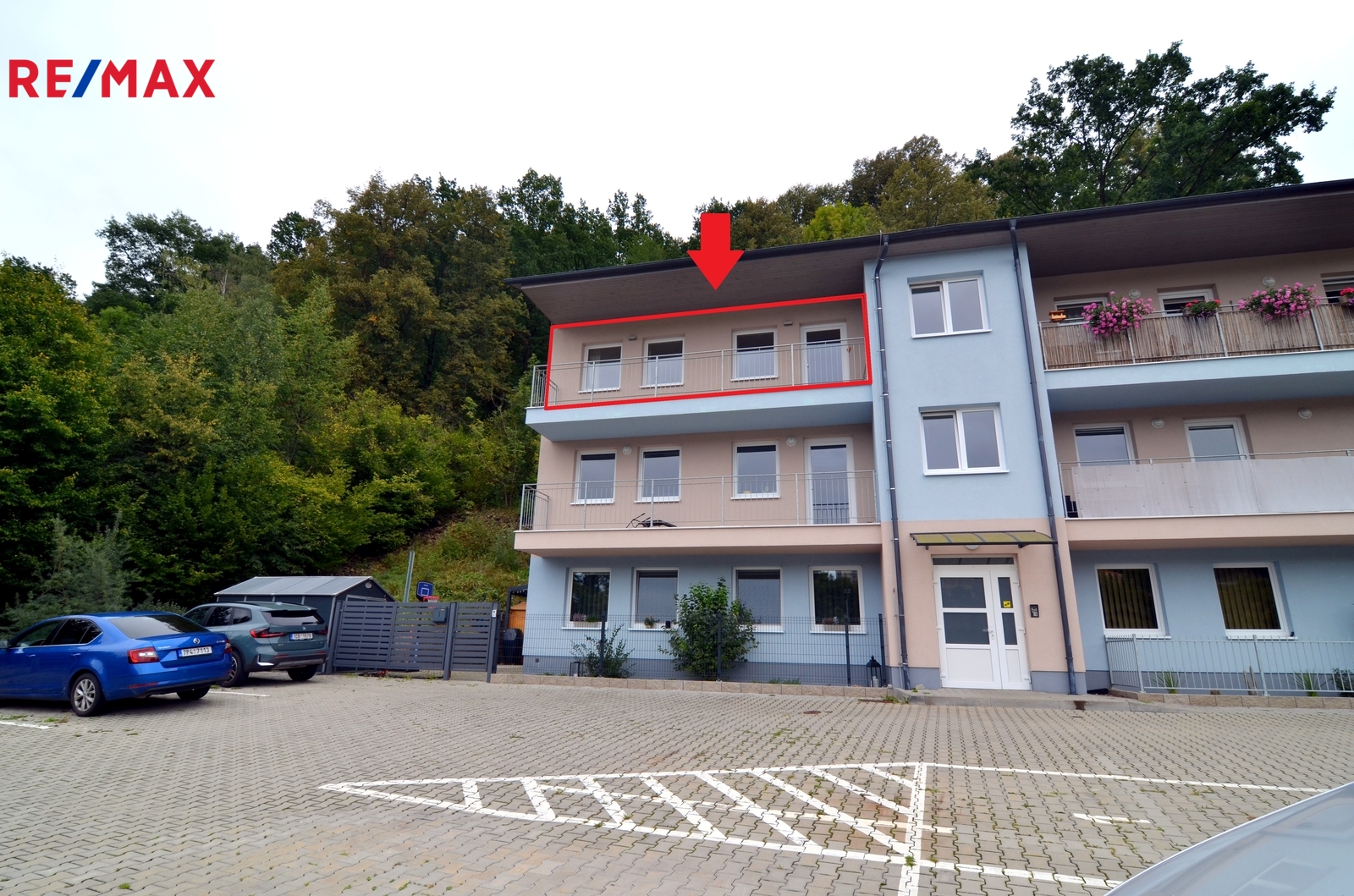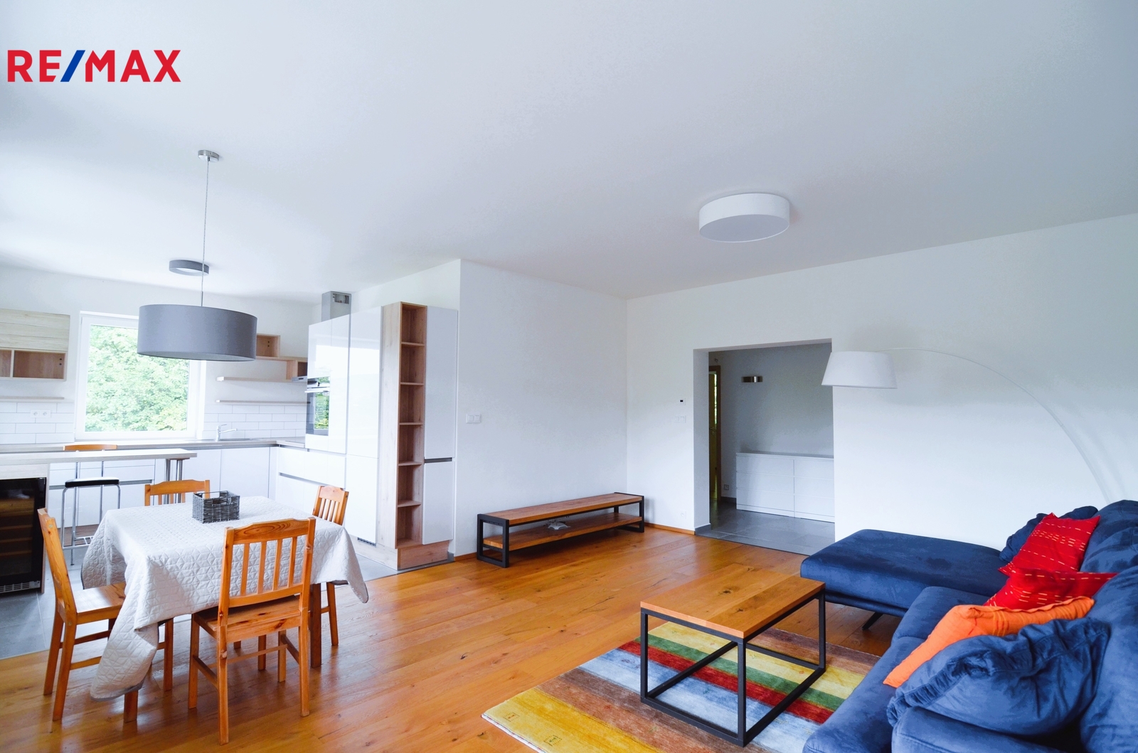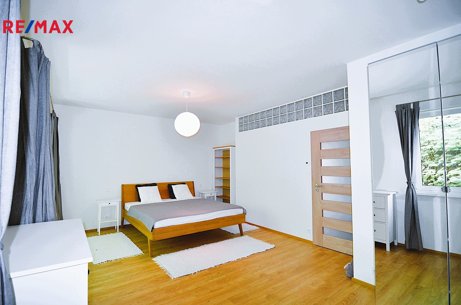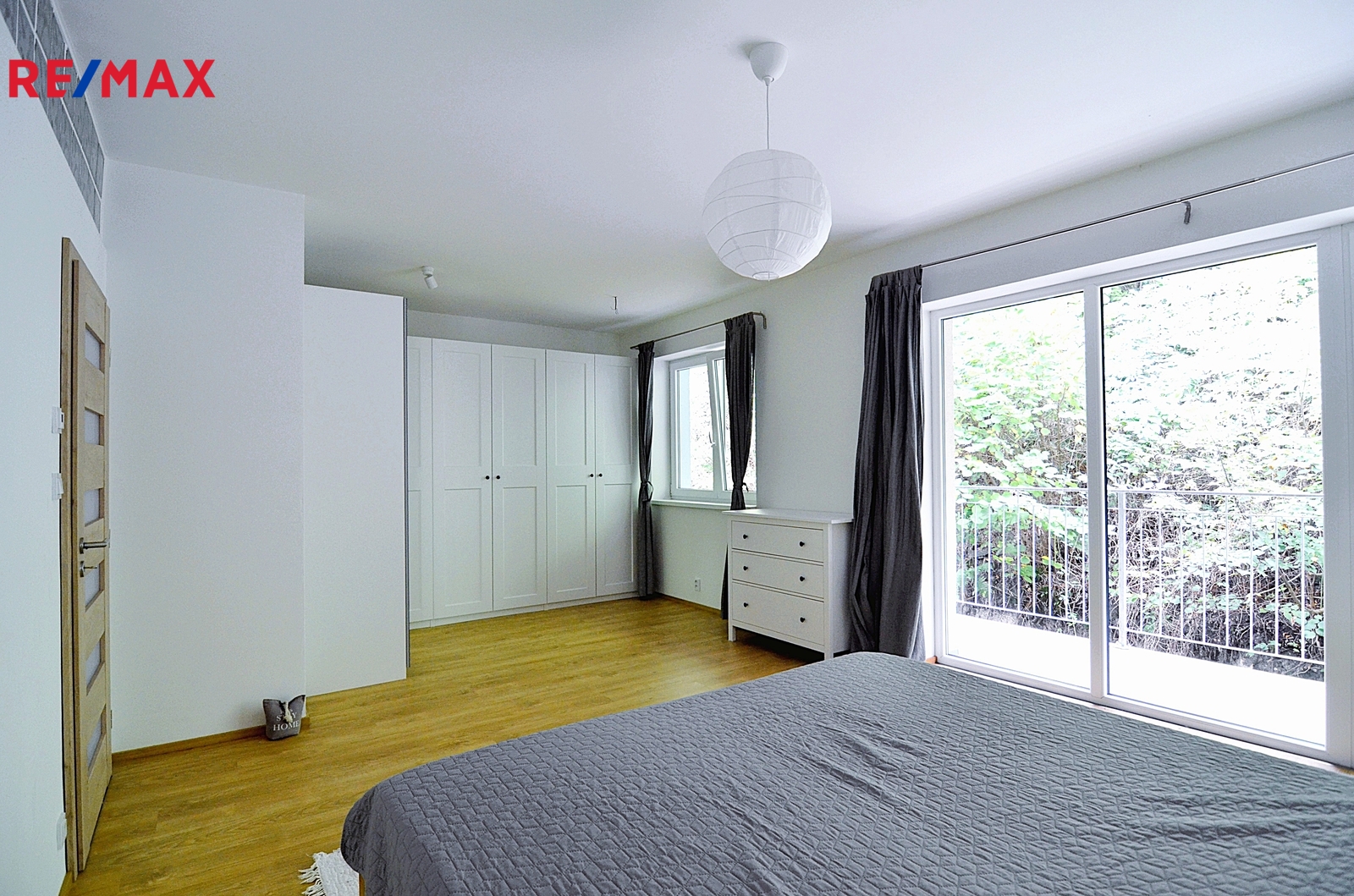 Byt se skládá ze světlého obývacího pokoje (38,4 m2) s kuchyňským koutem s mnoha okny na dvě světové strany a s výstupem na balkón o velikosti 11,5 m2. Dále z opravdu prostorné ložnice o velikosti 25,8 m2, s výstupem na druhý balkón o velikosti 5 m2. Tento pokoj lze v případě potřeby snadno přestavět vybudováním jedné příčky a přidáním dveří a vzniknou tak např. dva dětské pokoje (viz přiložené půdorysy bytu) Dále je v bytě další pokoj (17,1 m2). Ložnice jsou orientované na východ, směrem do zeleného zalesněného svahu, což poskytuje v této části bytu klid na spaní a v létě příjemný chládek. Prostorná světlá koupelna (8,1 m2) s přímým denním osvětlením je vybavena vanou, umyvadlem s koupelnovou skříňkou, WC ale také sprchovým koutem. V technické místnosti (6,4 m2) je další WC s umyvadlem a bidetovou sprškou a také elektrický bojler, pračka a sušička. Z prostorné vstupní haly je vstup do všech místností v bytě. Je zde i možnost připojení krbu nebo krbových kamen. Samotný vstup do bytu je jištěn bezpečnostními dveřmi. Na podlahách je kvalitní dřevěná podlaha z masivu a velkoformátová dlažba, v koupelně pak působivá dlažba v patchwork designu. Dveře v bytě jsou dřevěné, částečně prosklené v obložkových zárubních. Okna jsou bílá, plastová.