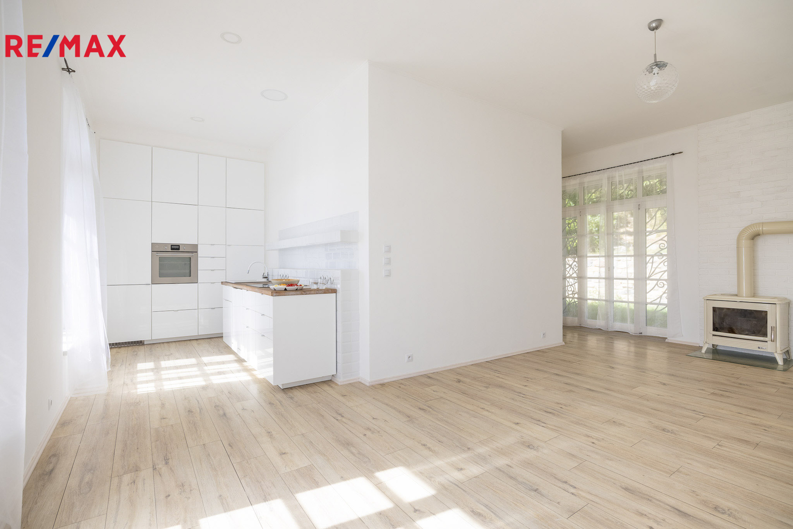 obývací pokoj s kuchyňským koutem a krbovými kamny, 3 ložnice, 2 koupelny s WC