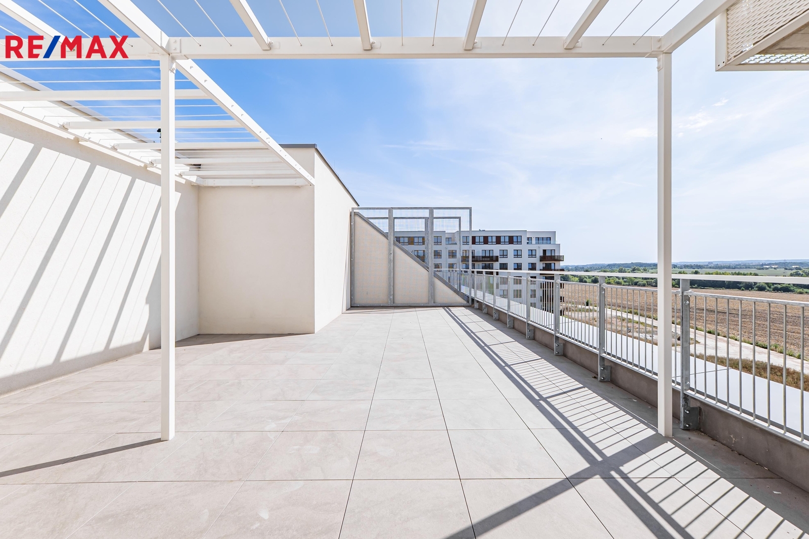 Z jedné z ložnic je přístup na balkon (6 m²), z obývací části pak vstup na rozlehlou terasu o ploše 50 m², která nabízí dostatek prostoru pro venkovní sezení, grilování a možnost zřízení druhé venkovní kuchyně.