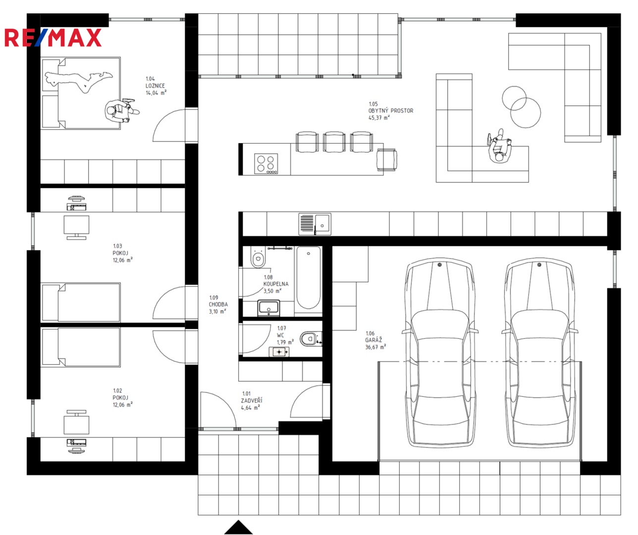 Ze zádveří s čistící zónou přes chodbu vstoupíte do prostorného obývacího pokoje (45,37 m²) s kuchyňským koutem a ostrůvkem, který tvoří přirozené centrum domova. Velká francouzská okna propojují interiér se zahradou a přinášejí do prostoru dostatek světla i výhled do zeleně.