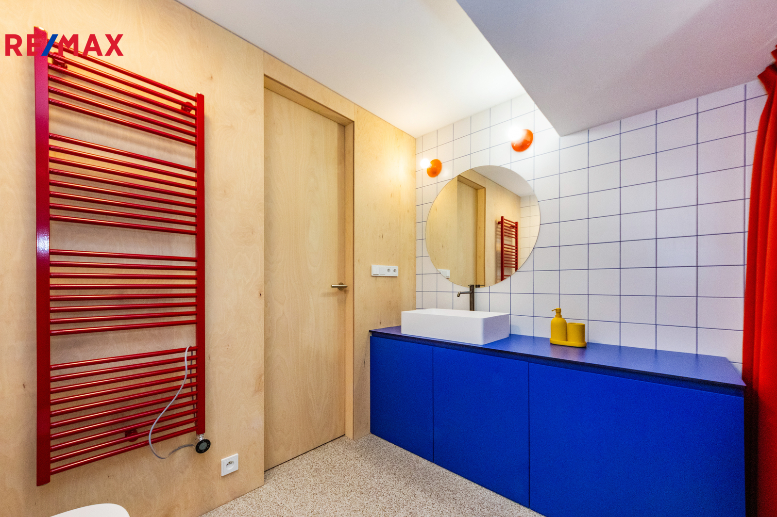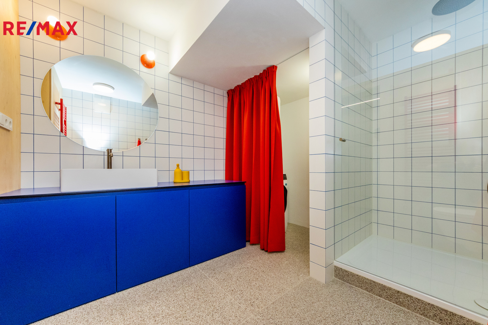 V bytě se dále nachází prostorná koupelna se sprchovým koutem, toaletou a prostorem pro pračku. Veškerý nábytek a vybavení bylo vyrobeno na míru, s důrazem na praktičnost a kvalitní zpracování.