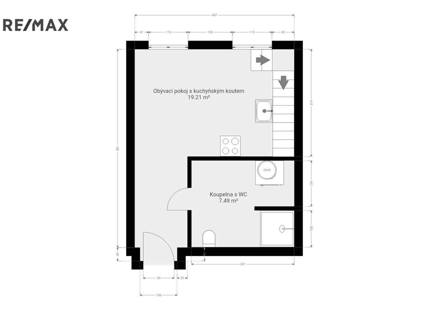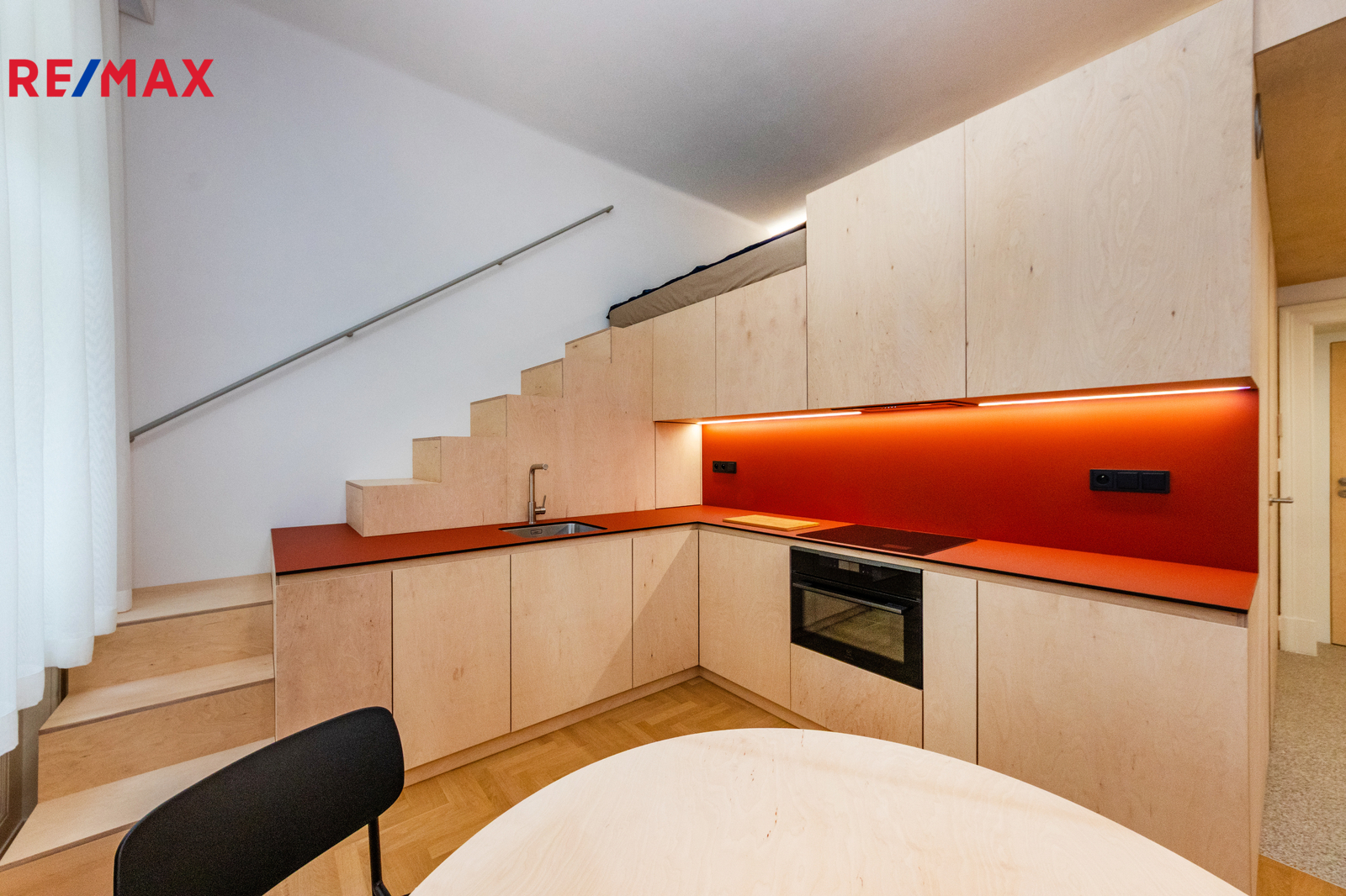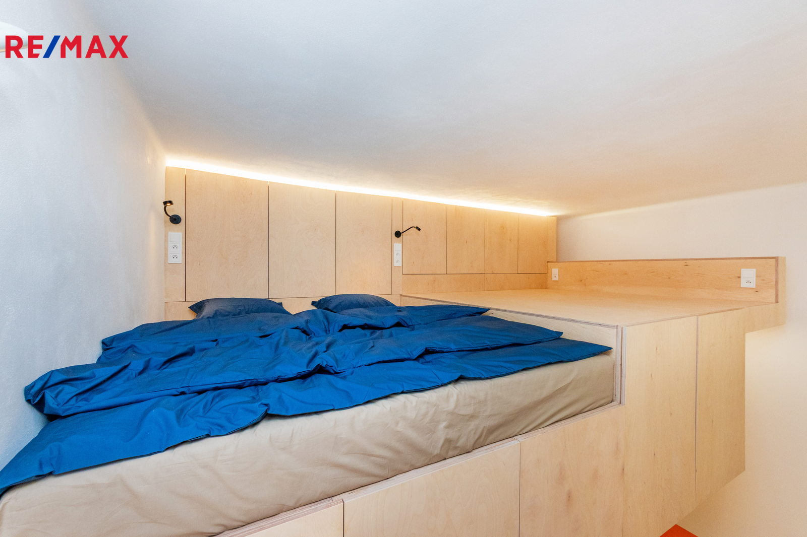 Byt je dispozičně řešen jako 1+kk s chytrým využitím prostoru. Dominantou je hlavní obytná místnost s plně vybavenou kuchyňskou linkou a praktickým vyvýšeným spaním, které vzniklo díky vysokým stropům. Tento řešený spací prostor výrazně šetří místo a zajišťuje větší komfort v běžném denním užívání.