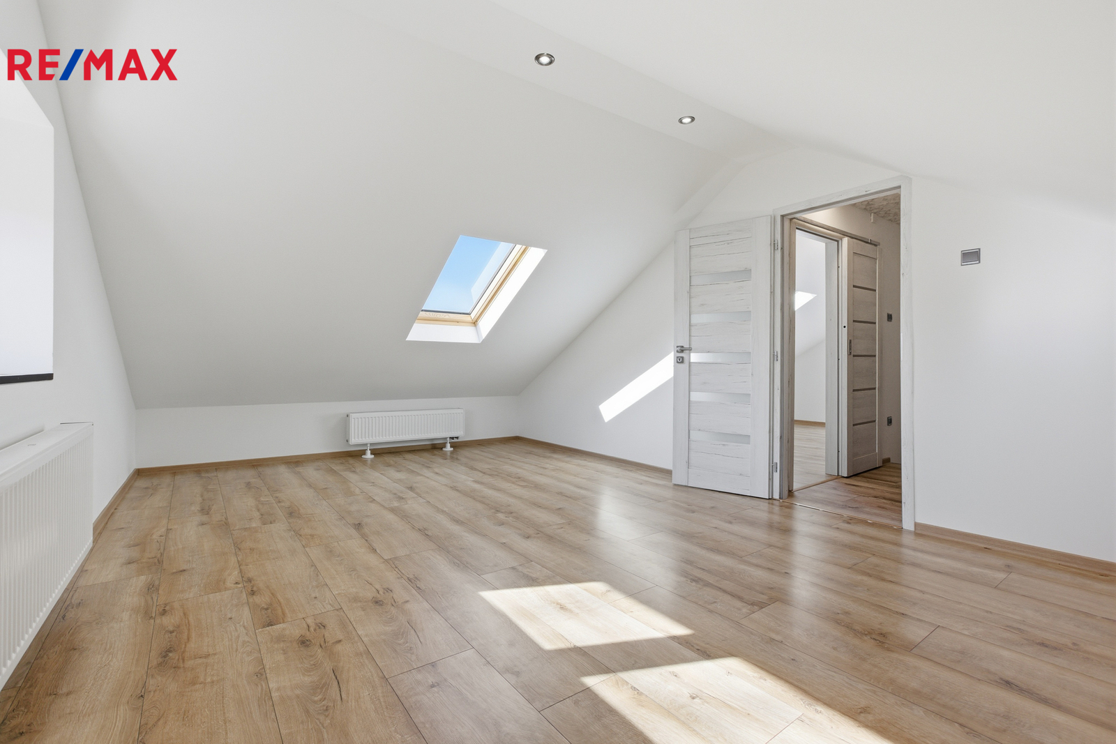 O dostatek světla a tepelný komfort se starají střešní okna Velux s trojsklem (140×90). Vstupní dveře jsou bezpečnostní, připravená je instalace pro kuchyňskou linku i připojení internetu a televize od T-Mobile.