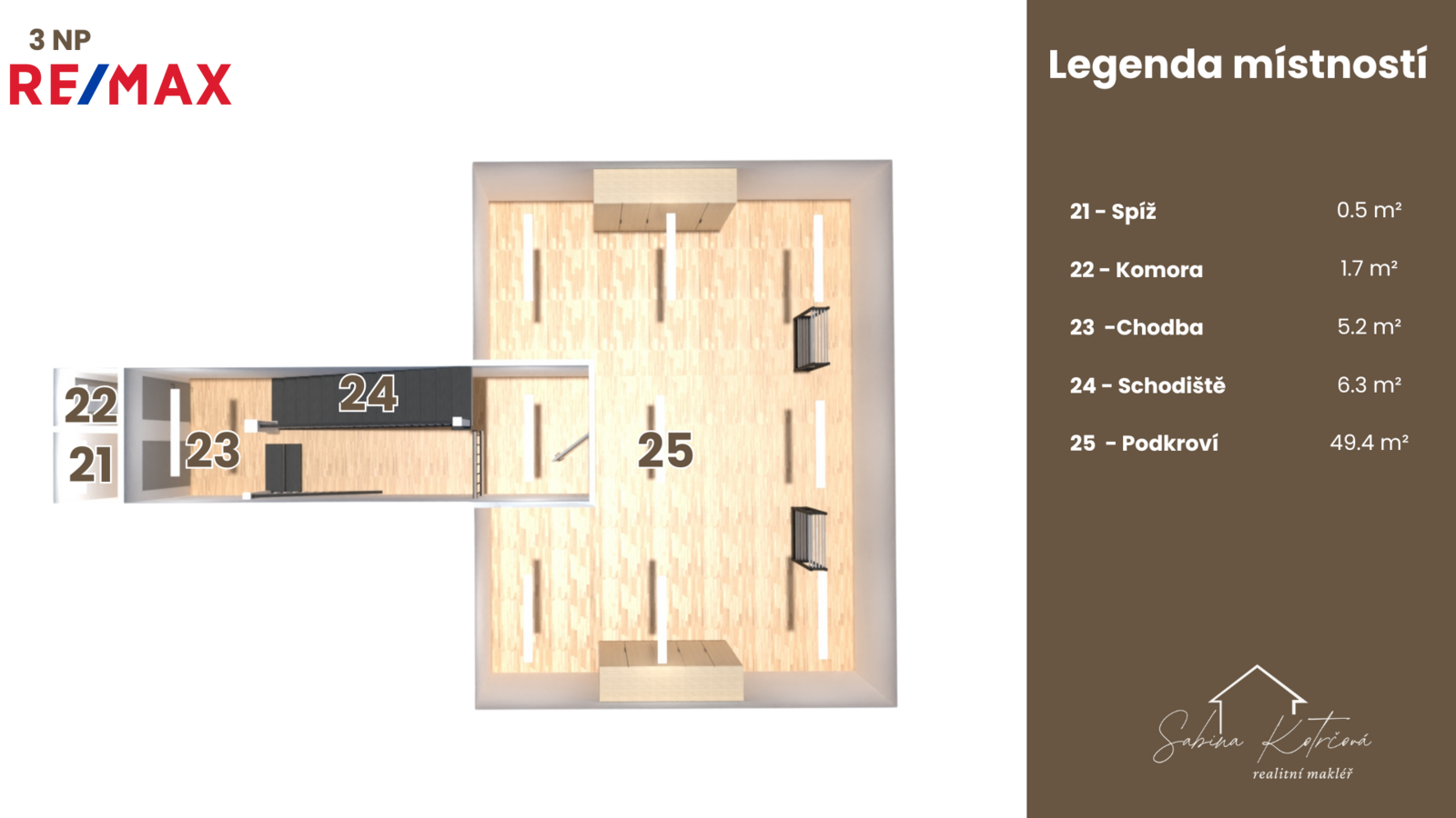 Okolí tvoří kultivovaná rezidenční čtvrť s výbornými sousedskými vztahy. Dům má navíc potenciál pro rozšíření o půdní vestavbu – nabízí se tak možnost vícageneračního bydlení, nebo zajímavá investiční příležitost. Díky své poloze, velikosti a variabilní dispozici je vhodný jak pro rodinné bydlení, tak pro kombinaci s podnikáním či pronájmem.