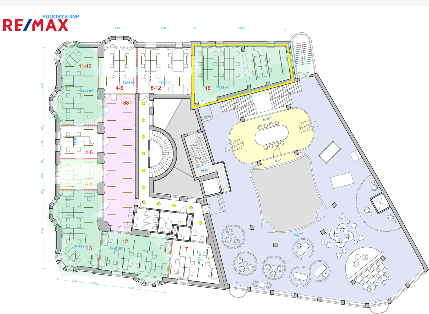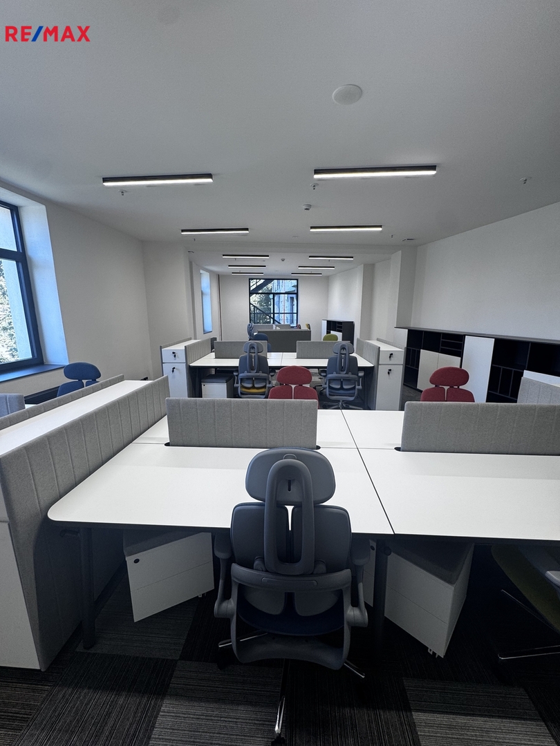 Kancelář se nachází ve 3. nadzemním podlaží a nabízí příjemný výhled na Náměstí Dr. E. Beneše. Má celkovou plochu 75 m² a je částečně vybavena nábytkem, který lze variabilně uspořádat a vytvořit open-space či více oddělených pracovních zón.