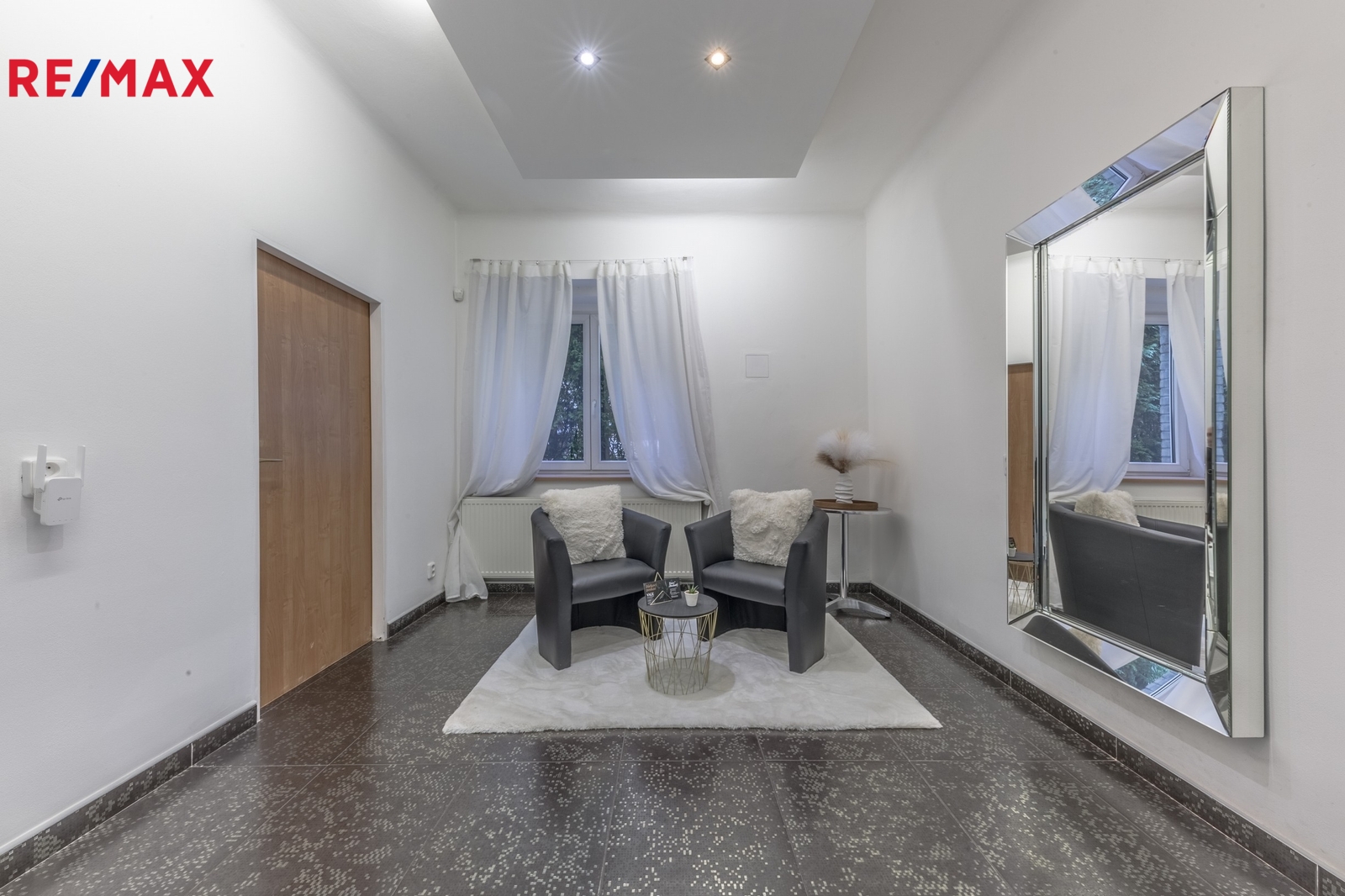 Prostor se nachází v suterénu domu, přístupný po krátkém schodišti přímo z ulice. Díky velkým oknům působí velmi světlým dojmem, z druhé strany je navíc v úrovni zahrady, což dodává klid a přirozené světlo. Před vchodem je umístěna dobře viditelná plocha pro reklamu – ideální pro logo nebo brand vaší služby.