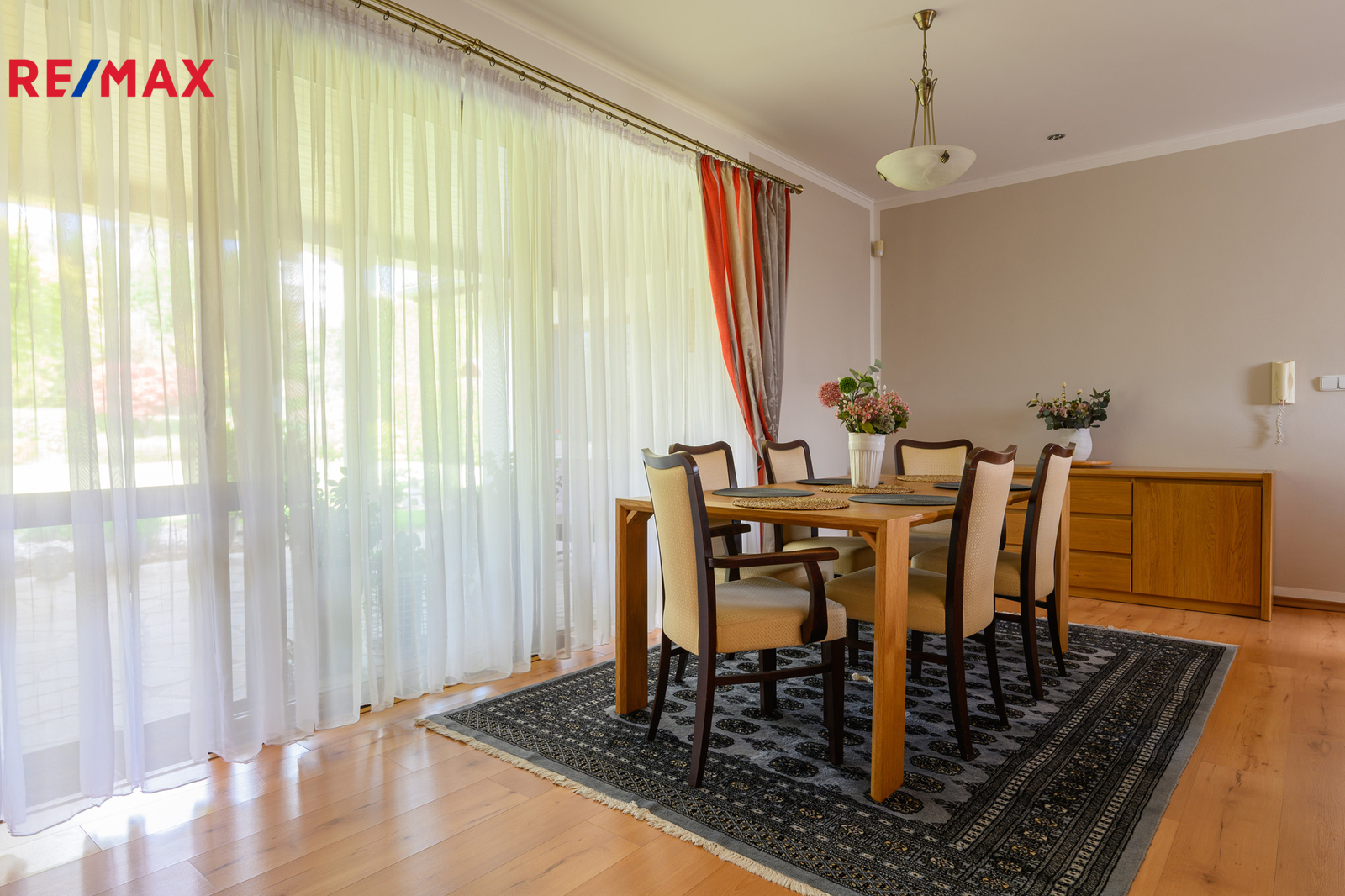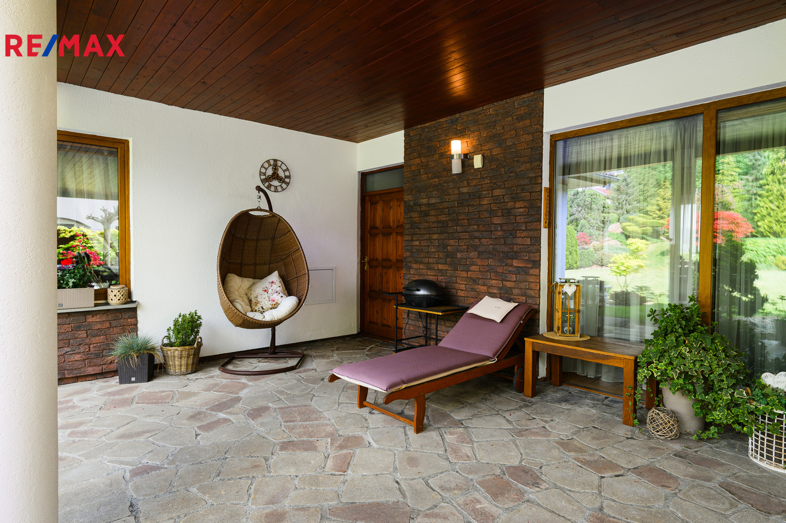 Z obývacího pokoje je vstup na zastřešenou terasu (40 m²) a do okrasné zahrady.