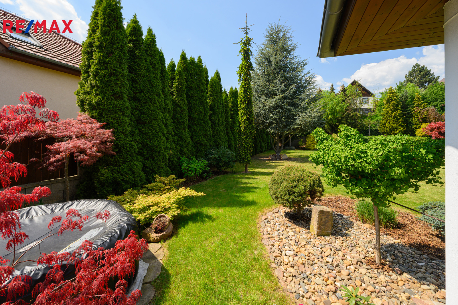 Zahrada je navržena v japonském stylu jako klidová zóna s okrasnými dřevinami, trávníkem se závlahovým systémem a velkou zastřešenou terasou vhodnou pro odpočinek či rodinná setkání. Součástí pozemku je také samostatná technická místnost pro zahradní vybavení.