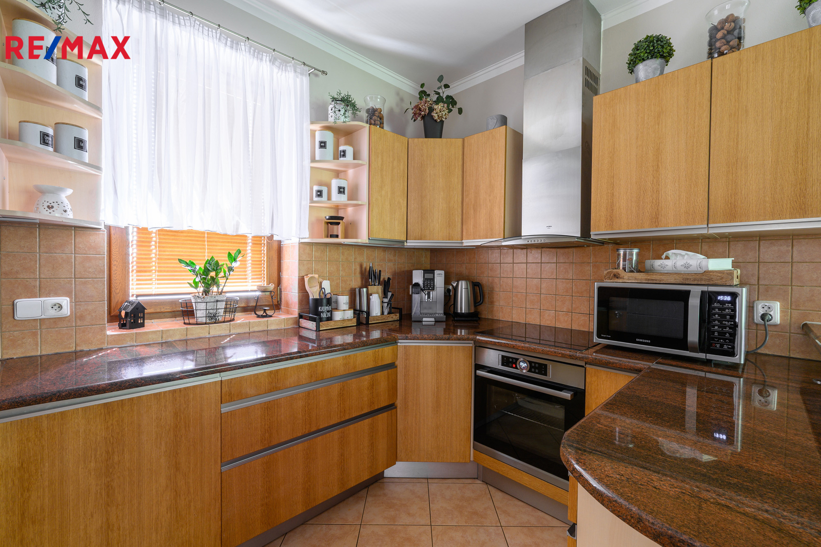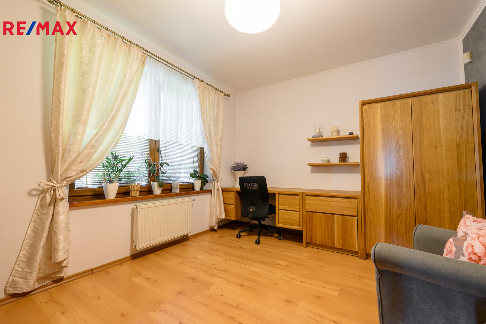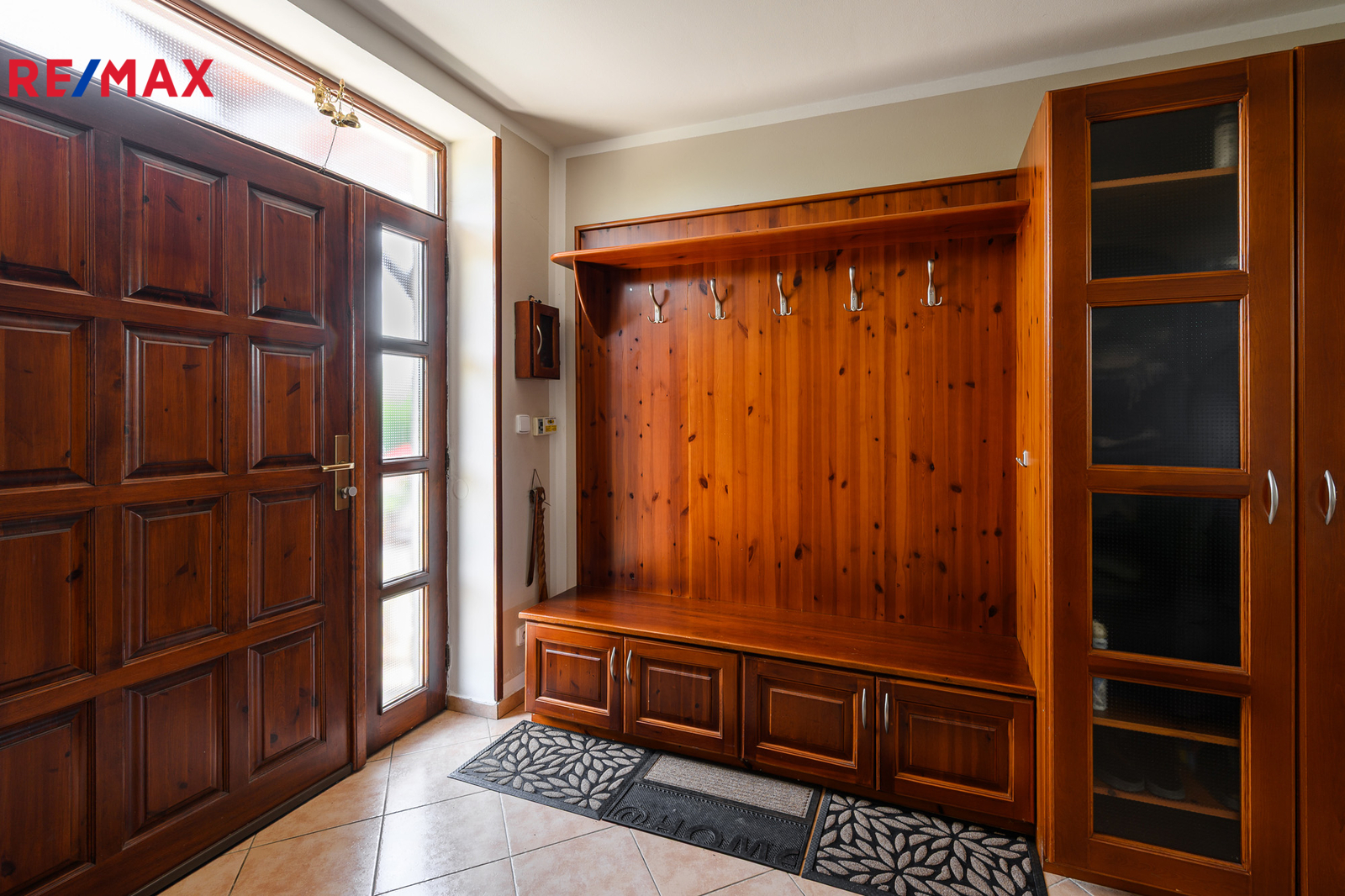 prostorný obývací pokoj propojený s kuchyní a jídelnou, tři ložnice, koupelna s WC, samostatné WC, šatna a chodba s vestavěnými skříněmi.