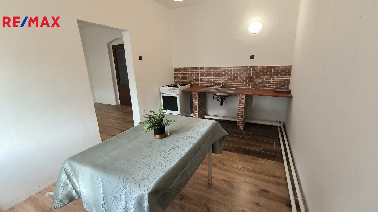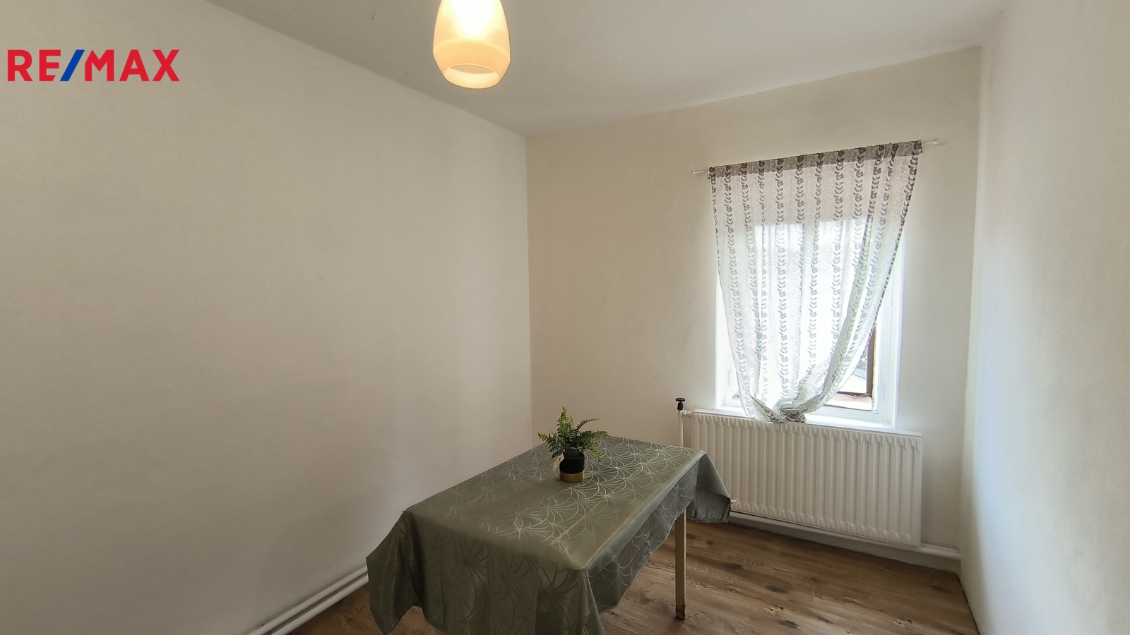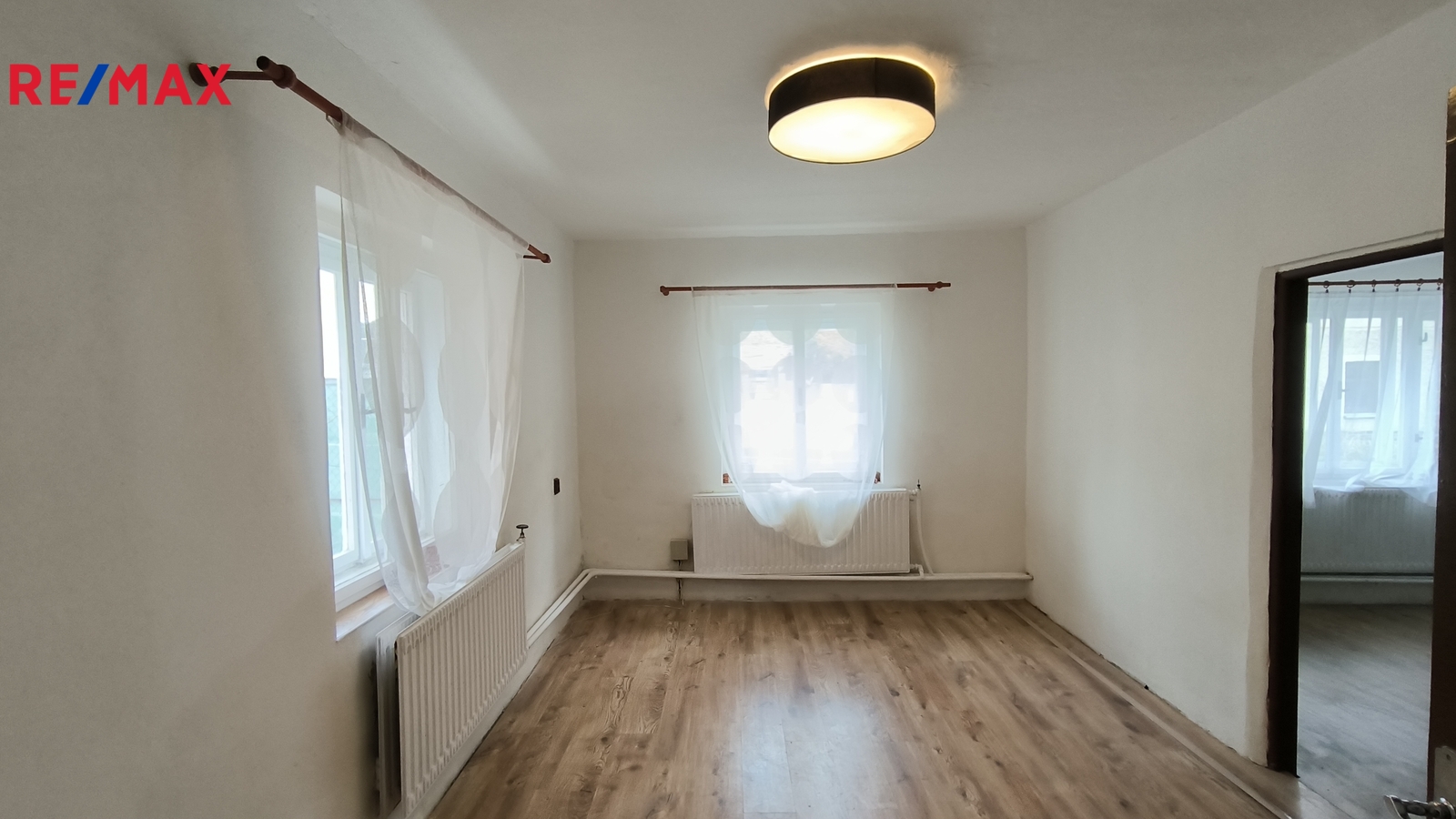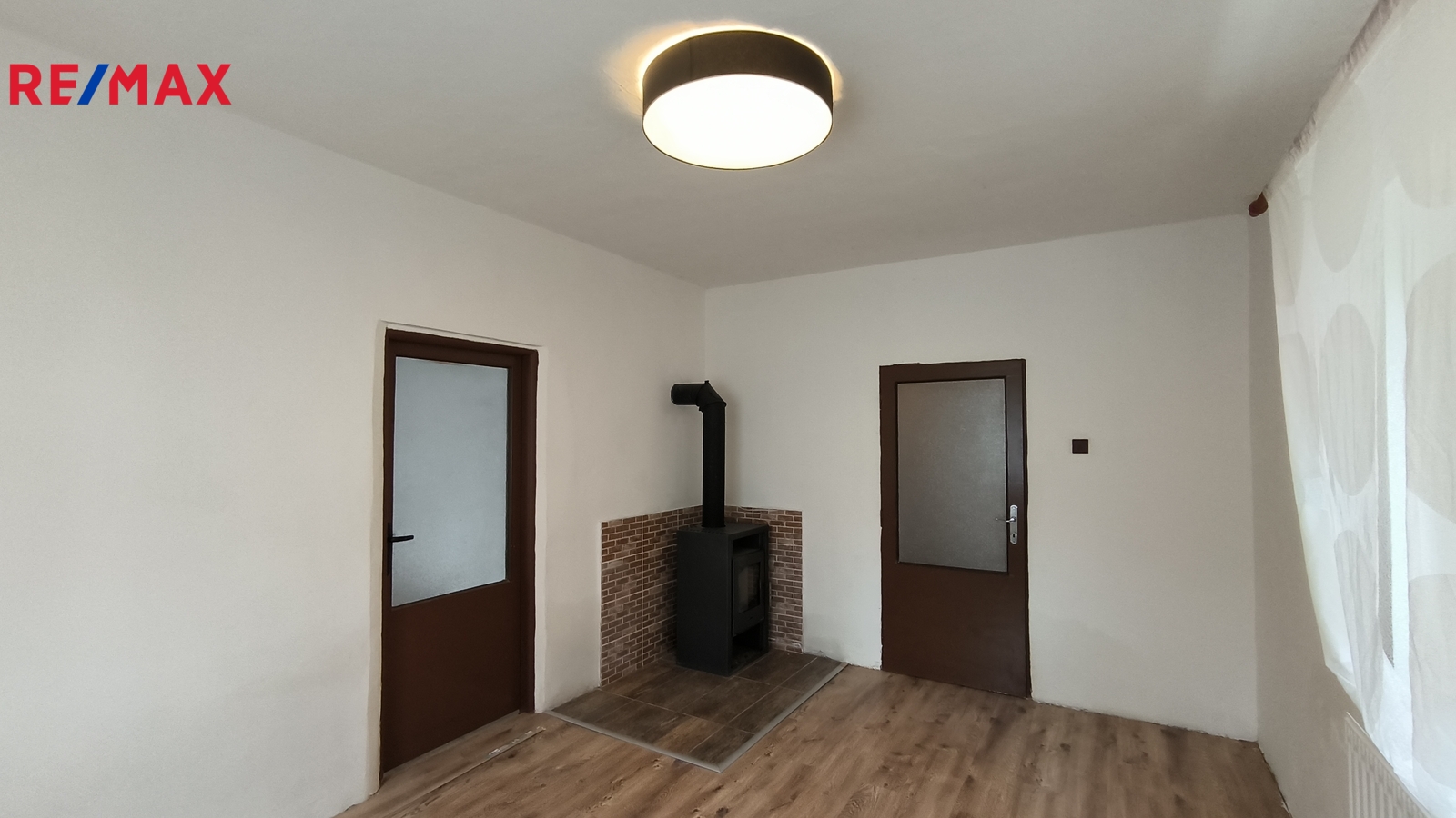 V přízemí domu se nacházejí tři rekonstruované pokoje, kuchyň a nově opravená koupelna. Vnitřní prostory jsou světlé, vzdušné a působí velmi útulně. V jednom z pokojů je částečně obložená zeď s krbovými kamny, které spolehlivě vytopí minimálně dva sousední pokoje, případně i další při otevřených dveřích.