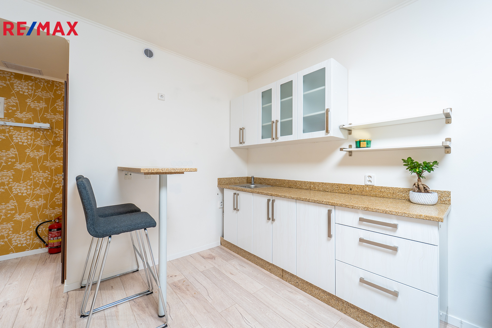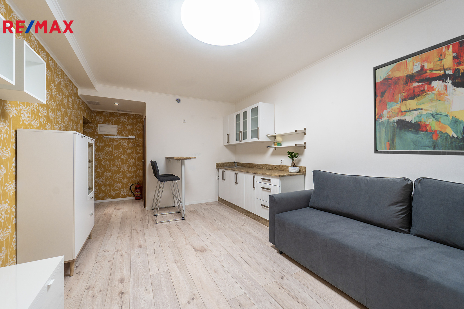 V obytném pokoji se nachází kuchyňská linka (lednice, elektrický vařič, možno dodat mikrovlnnou troubu), rozkládací sedačka (šířka lůžka: 140 cm), jídelní sezení a skříně dle fotografií. V koupelně sprchový kout, WC, umyvadlo, elektrický topný žebřík. V oknech bytu jsou nainstalovány žaluzie a sítě proti hmyzu, vstupní dveře jsou bezpečnostní. V domě je rozvedeno připojení k internetu. Byt se nabízí včetně vybavení, které je zobrazeno na fotografiích, a je připraven k okamžitému nastěhování. K bytu patří sklepní kóje umístěná přede dveřmi do bytu. V bytě není pračka.