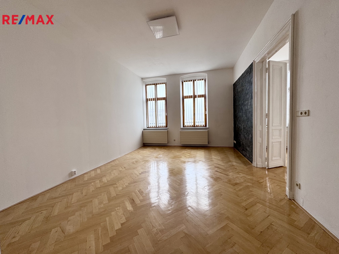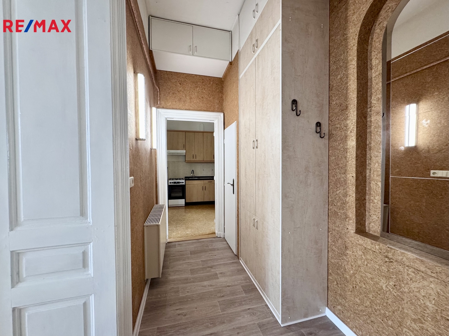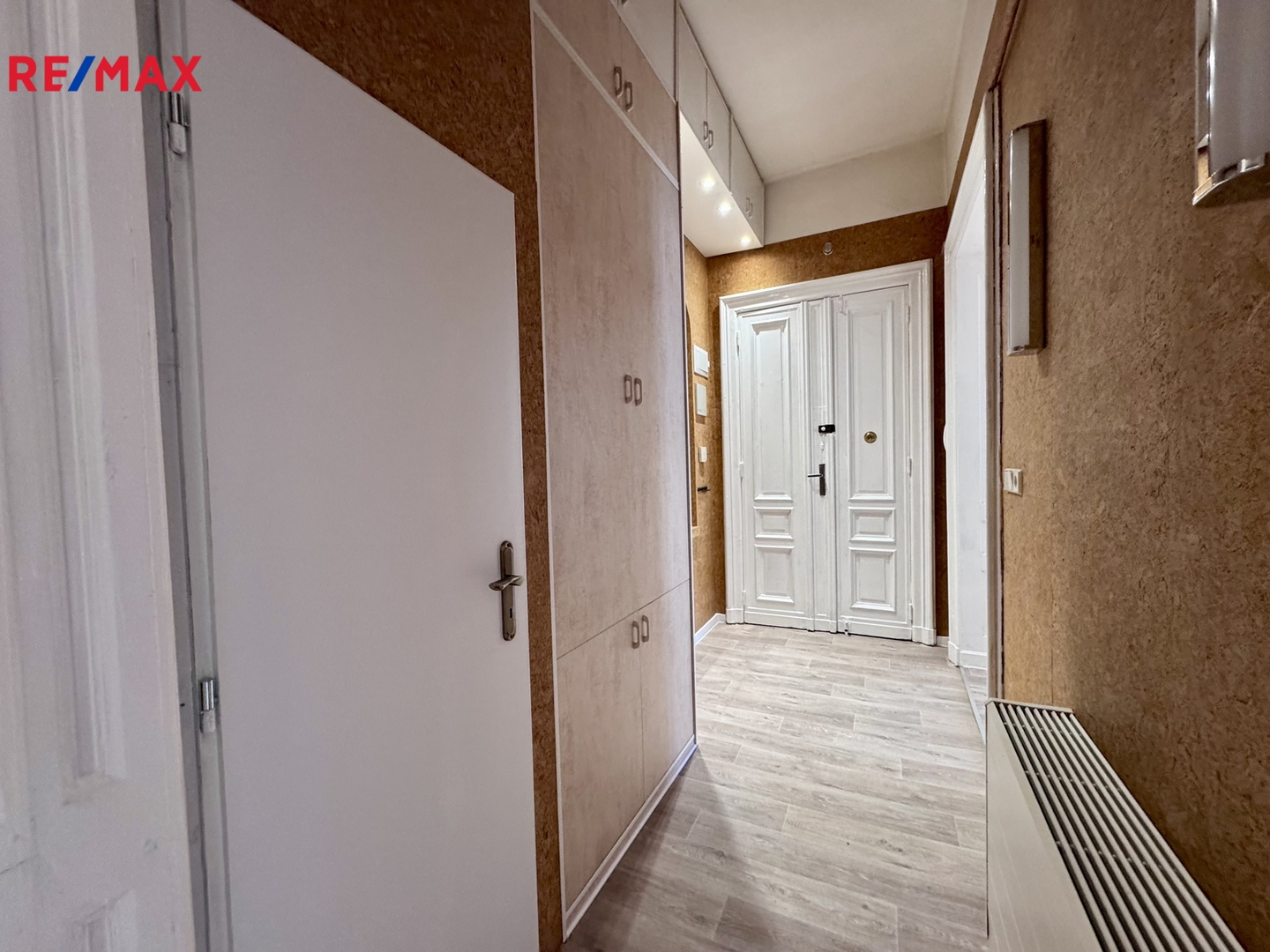 Dominantou bytu jsou dvoukřídlé dveře, které zdůrazňují historický charakter interiéru a opakují se i v jednotlivých místnostech.