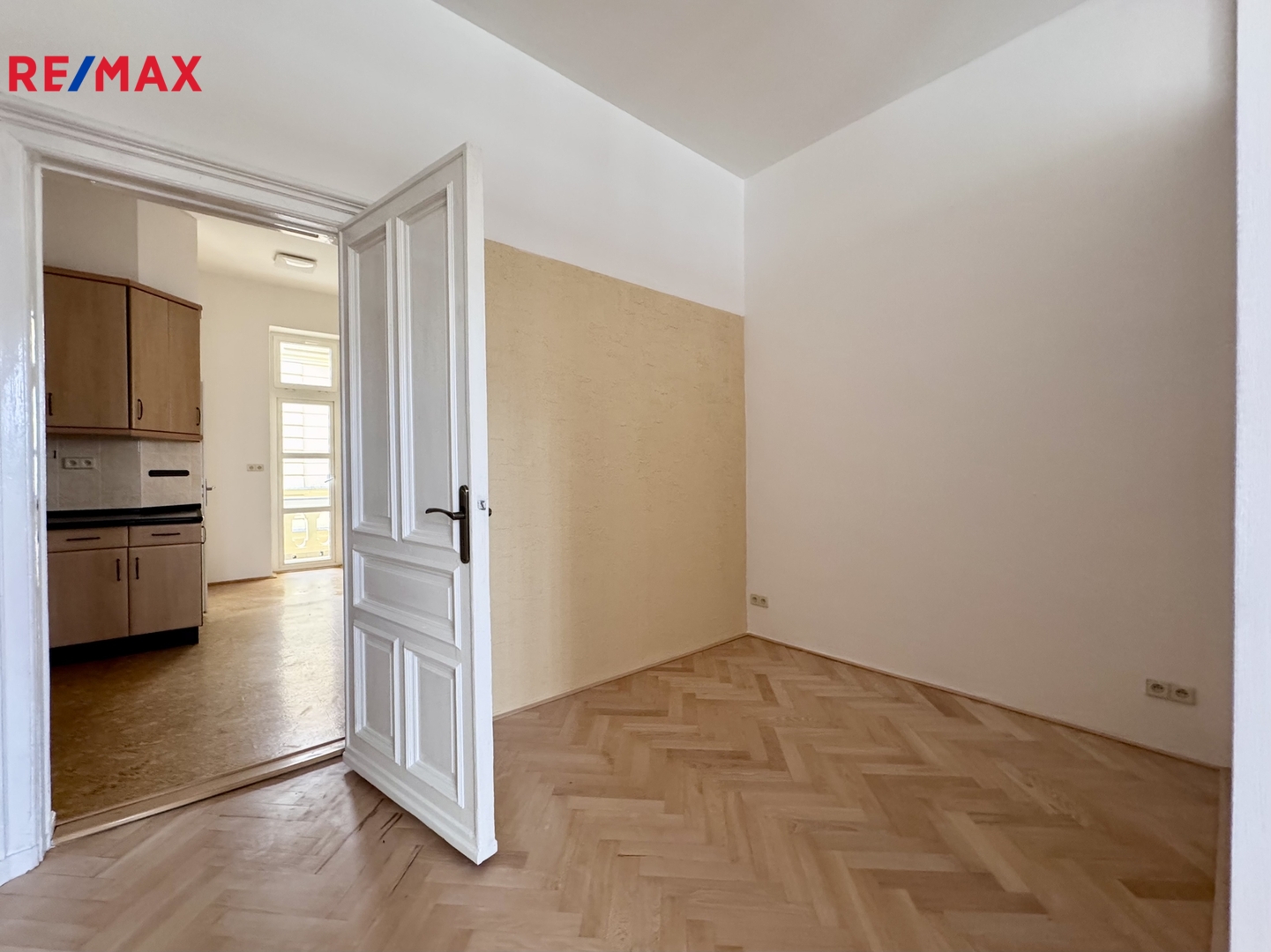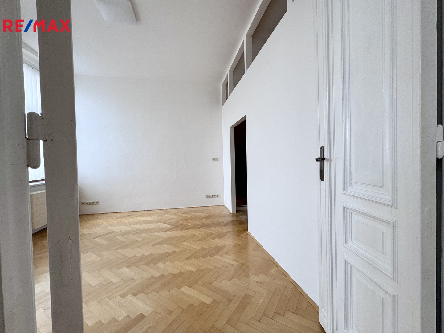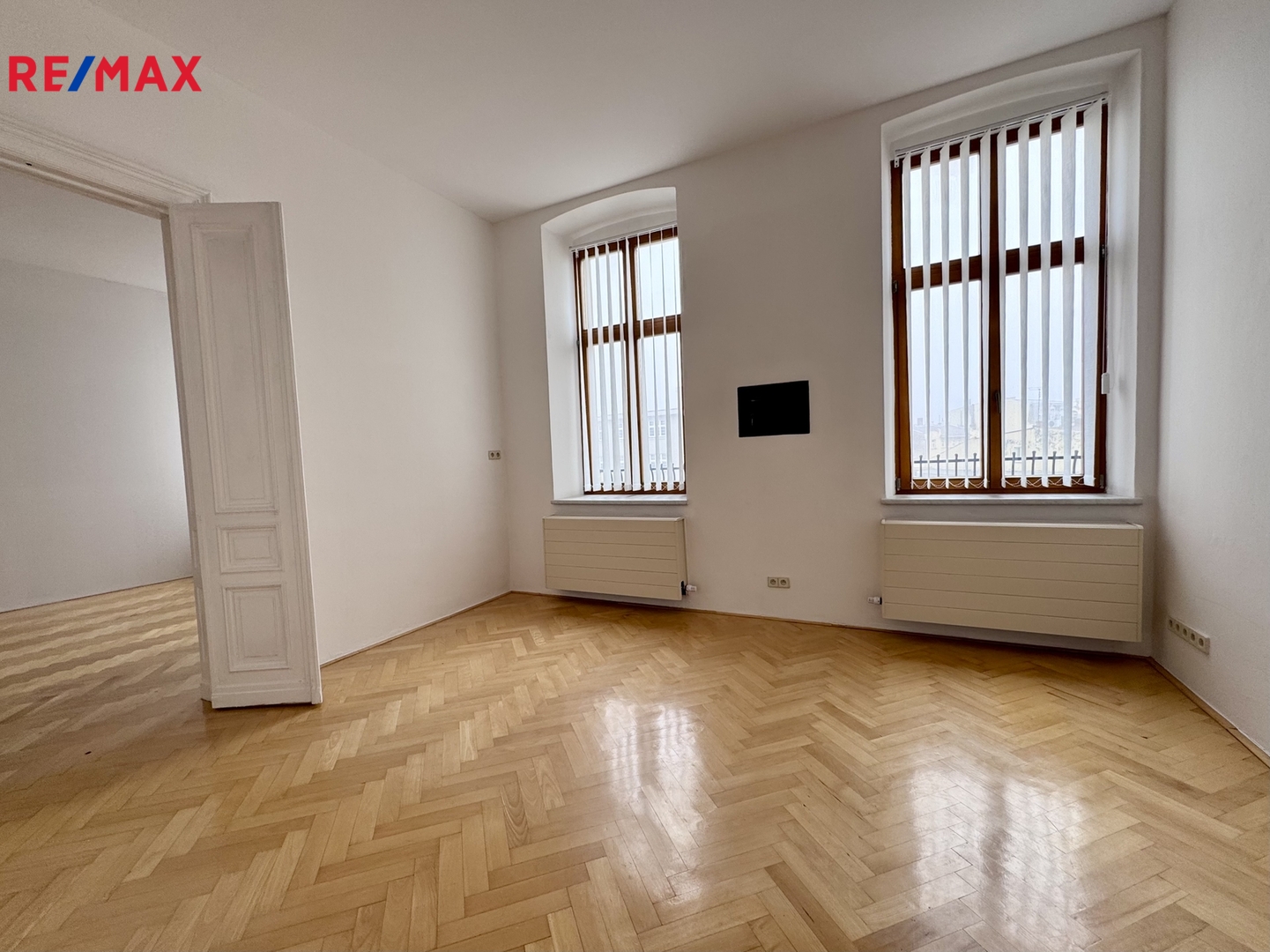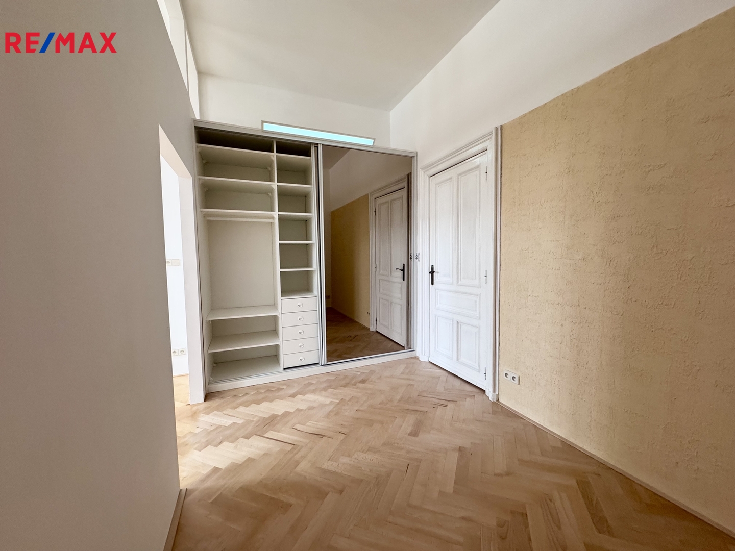 Dominantou bytu jsou dvoukřídlé dveře, které zdůrazňují historický charakter interiéru a opakují se i v jednotlivých místnostech.