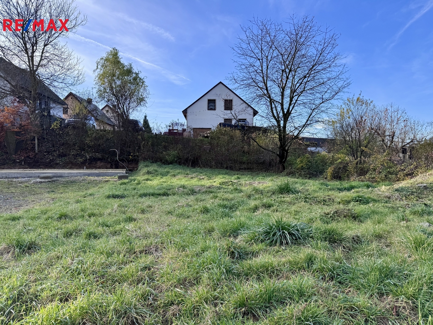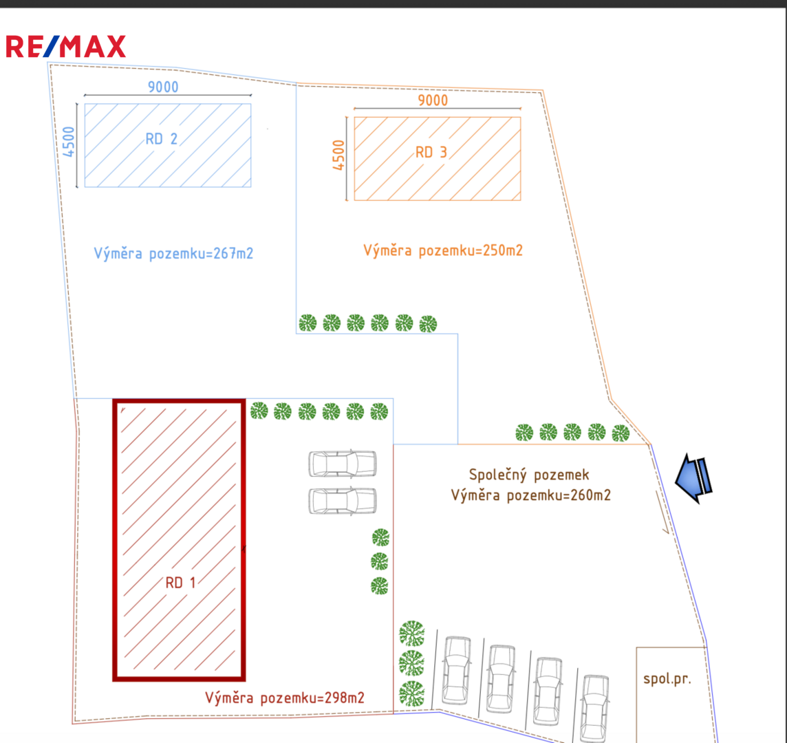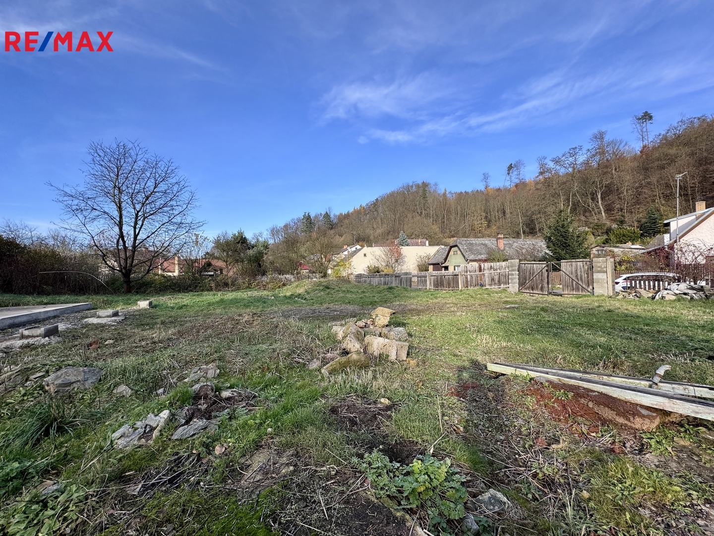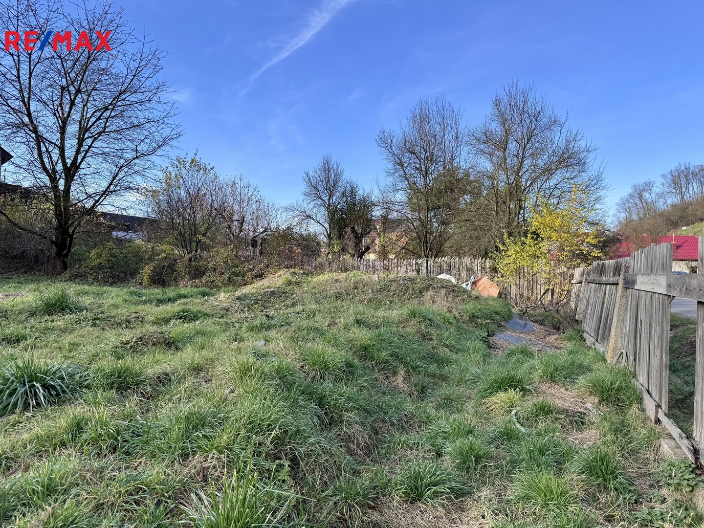 Pozemek tvoří tři samostatné parcely. Součástí prodeje je stavební povolení včetně projektové dokumentace.