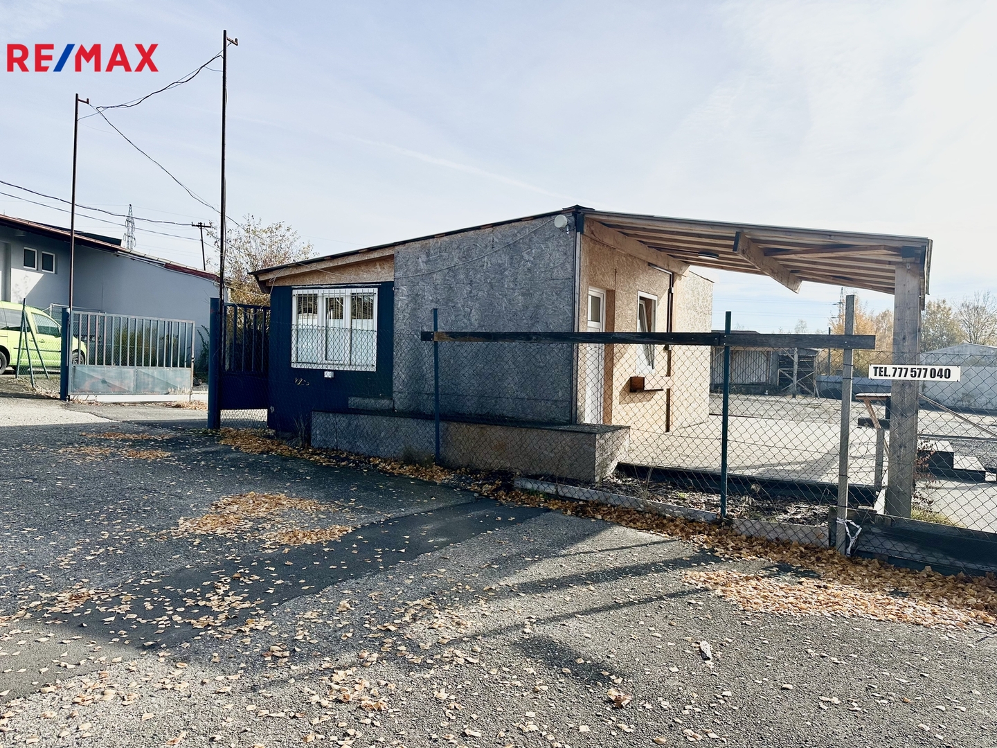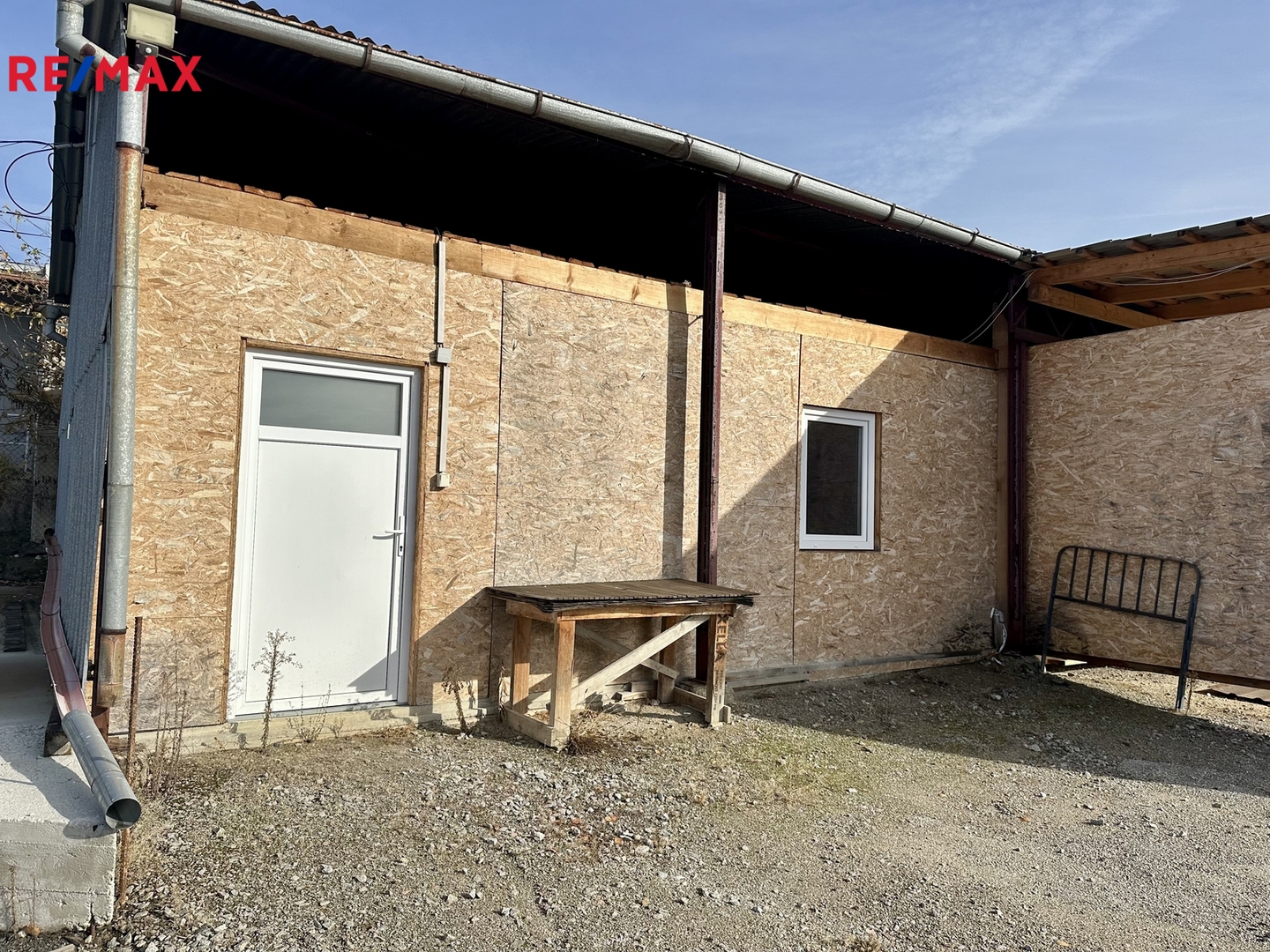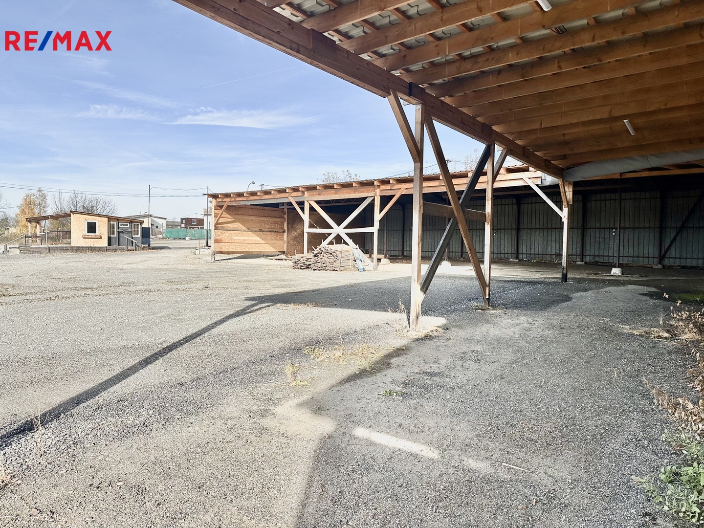 Oplocená plocha se dvěma vjezdy a bránami zahrnuje zastřešené stání a jednu uzavřenou halu bez zavíracích vrat se silnými jističi (72 A), která byla v minulosti využívaná pro truhlářskou nebo dílenskou výrobu. Navíc je k dispozici ještě další uzavřená hala, která je suchá a uzamykatelná, vhodná jako další dílna nebo sklad. Součástí areálu je buňka sloužící jako kancelář s kuchyňkou a WC.