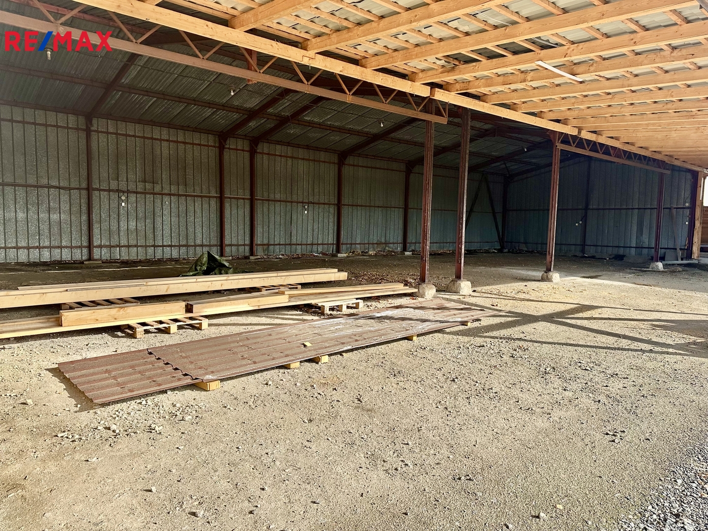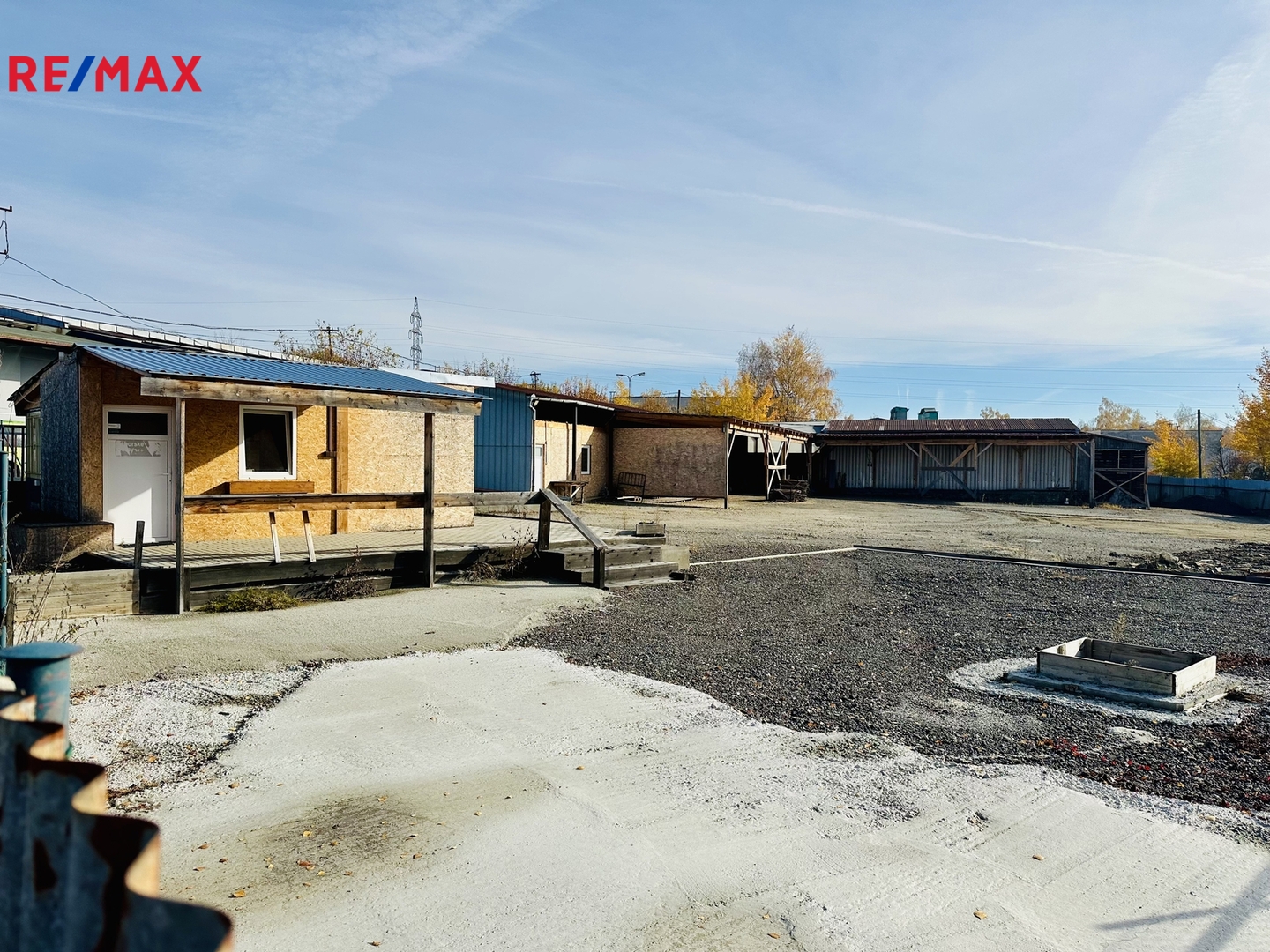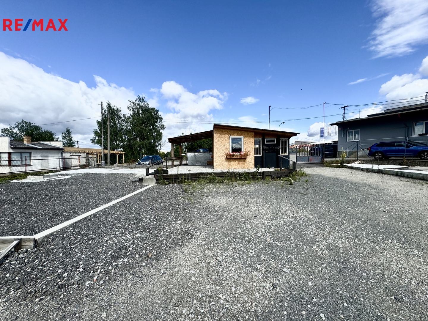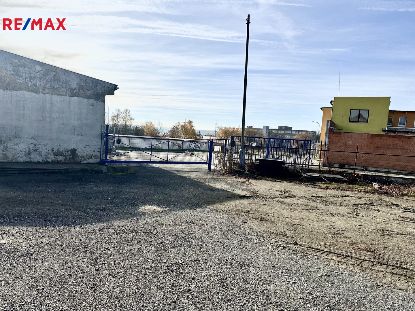 Oplocená plocha se dvěma vjezdy a bránami zahrnuje zastřešené stání a jednu uzavřenou halu bez zavíracích vrat se silnými jističi (72 A), která byla v minulosti využívaná pro truhlářskou nebo dílenskou výrobu. Navíc je k dispozici ještě další uzavřená hala, která je suchá a uzamykatelná, vhodná jako další dílna nebo sklad. Součástí areálu je buňka sloužící jako kancelář s kuchyňkou a WC.
