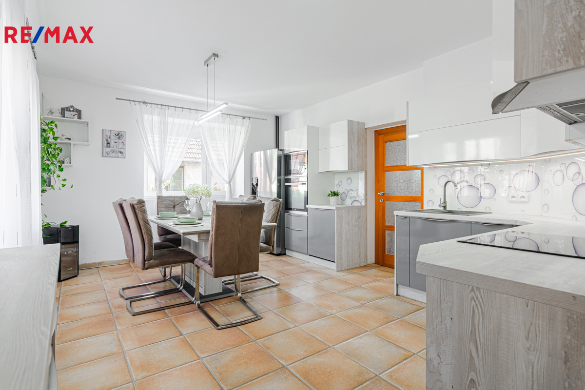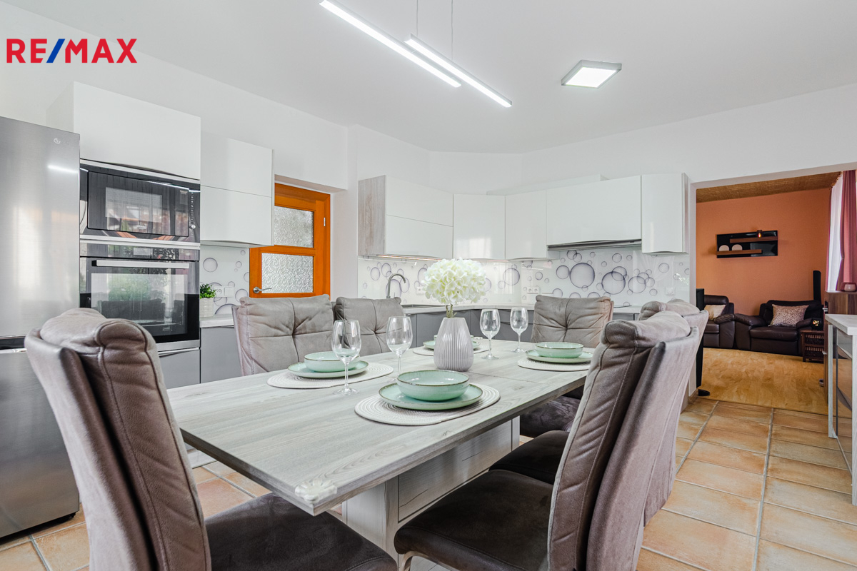 V přízemí se nachází prostorný obývací pokoj, jídelna s kuchyňským koutem, toaleta, technická místnost a velká vstupní hala. Součástí moderní kuchyňské linky je myčka, indukční deska, horkovzdušná i mikrovlnná trouba, digestoř a americká lednice. V mezipatře najdete koupelnu s rohovou vanou a toaletou. Druhé podlaží tvoří ložnice, dětský pokoj a prostorná pracovna. Pokoje v tomto patře jsou vybaveny klimatizací. V kuchyni, obývacím pokoji a dětském pokoji je podlahové vytápění. Topení a ohřev vody zajišťuje tepelné čerpadlo. Dům je zateplený a má plastová okna. Dům je vybaven vlastní čističkou odpadních vod, zároveň je zde možnost připojení na veřejnou kanalizaci. Napojen je na obecní vodovodní řád.