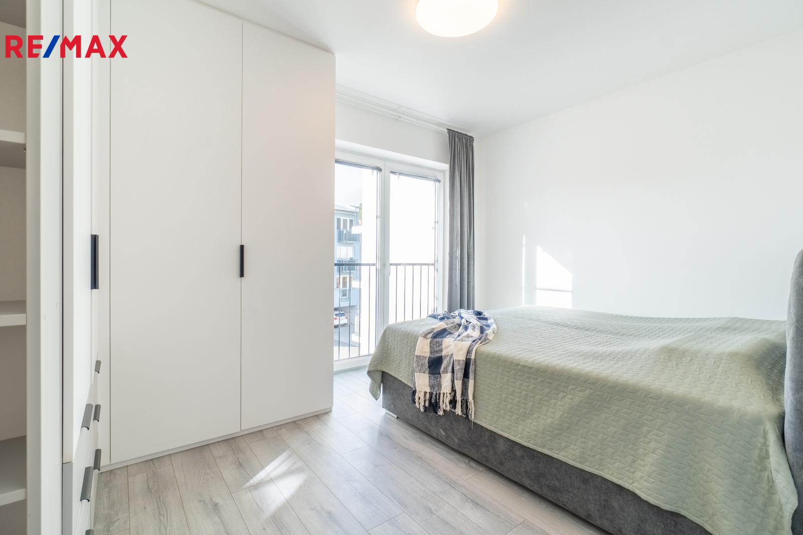 V obývacím pokoji s kuchyňským koutem je vstup na prostorný balkon, ideální pro ranní kávu. Obývací část je zařízena rozkládací sedačkou a jídelním stolem se židlemi. Kuchyňská linka je vybavena vestavěnými spotřebiči: varná deska, myčka, lednice, trouba, mikrovlnná trouba a digestoř. Na stejné straně se nachází dětský pokoj či pracovna s flexibilním využitím, vybavená pracovním stolem. Dále je k dispozici ložnice s manželskou postelí a vestavěnou skříní.