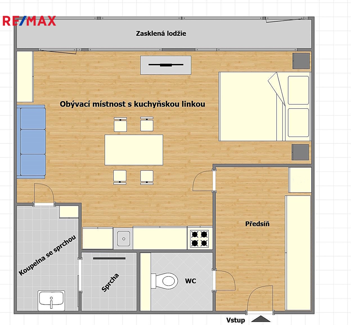 Byt 1+kk (34m2) + zasklená lodžie (6m2) + komora na chodbě (2m2) + sklepní kóje (2m2) je v osobním vlastnictví a prošel kompletní rekonstrukcí – nové rozvody vody, elektřiny a topení, kuchyňská linka, koupelna se zděným sprchovým koutem, WC, podlahy, okna i dveře.