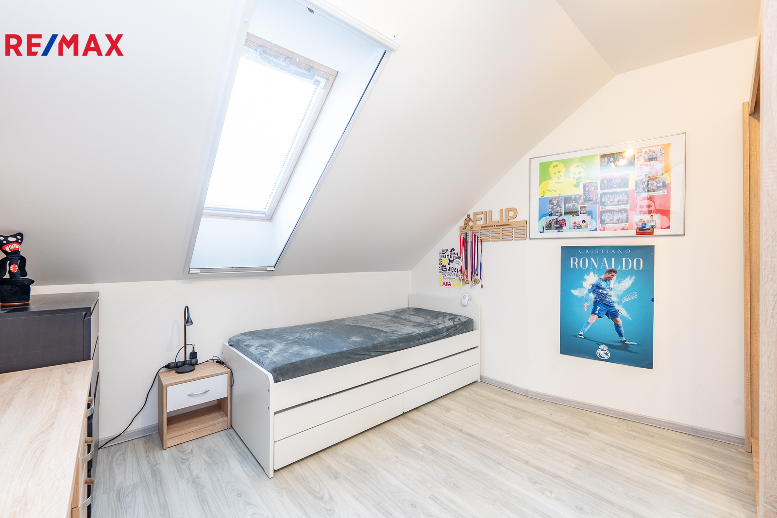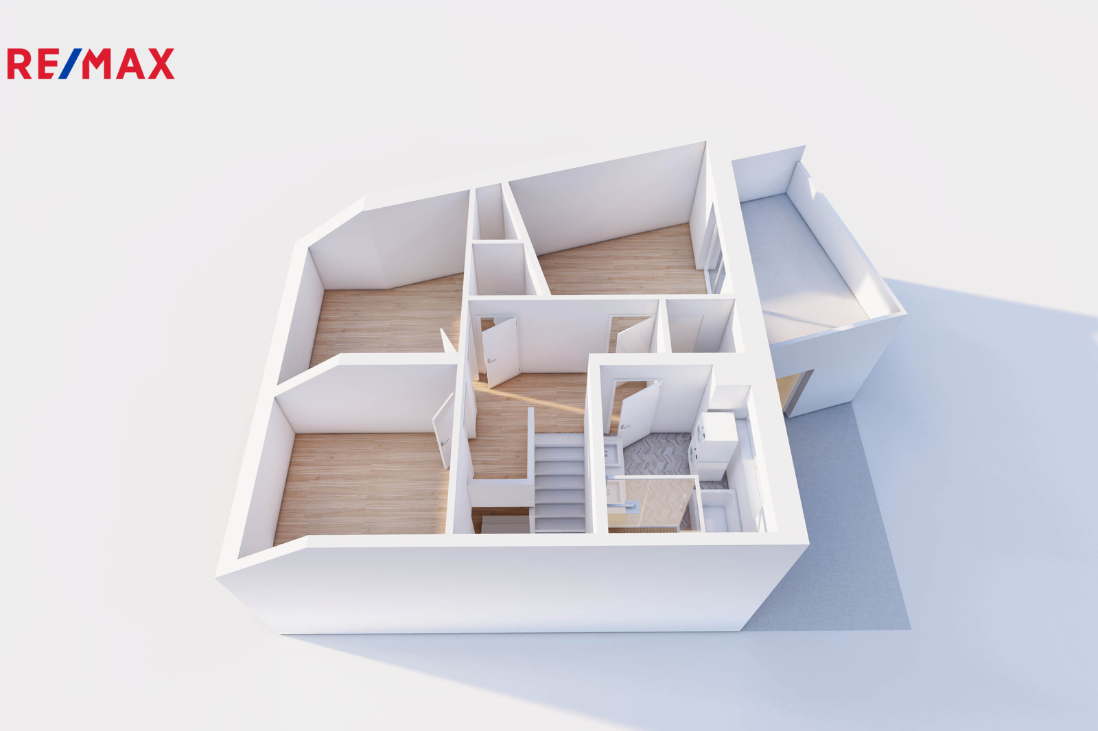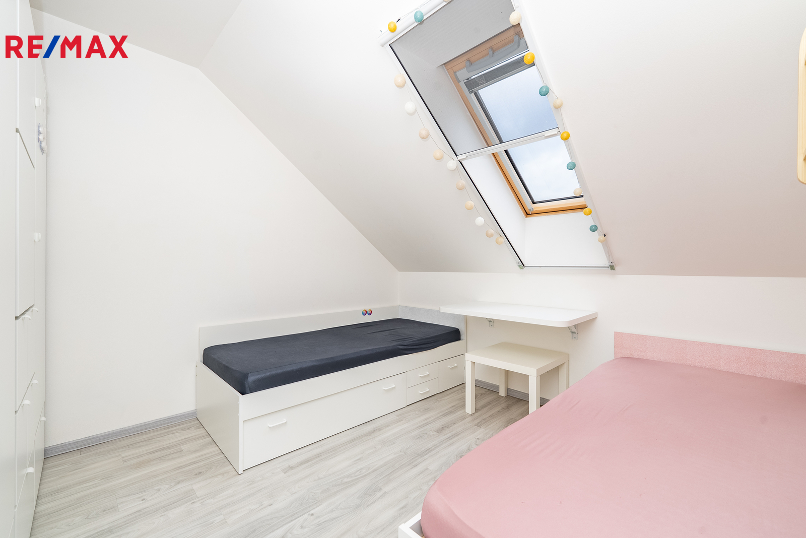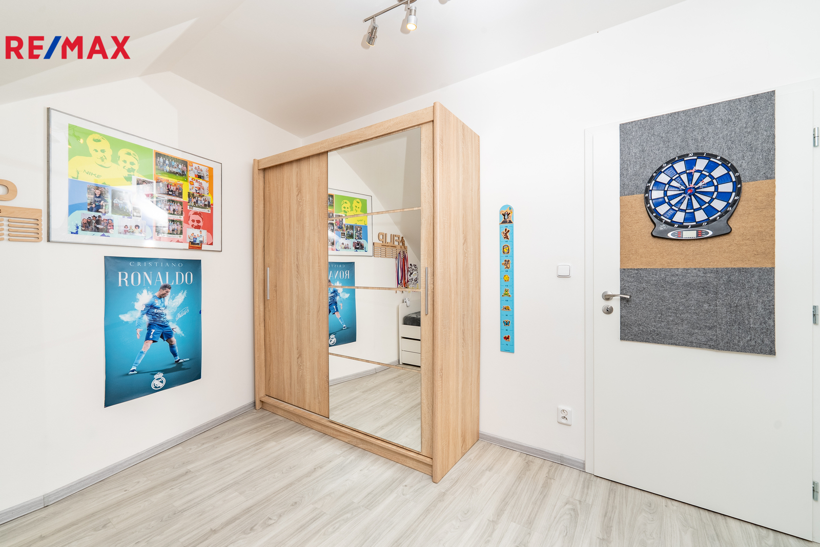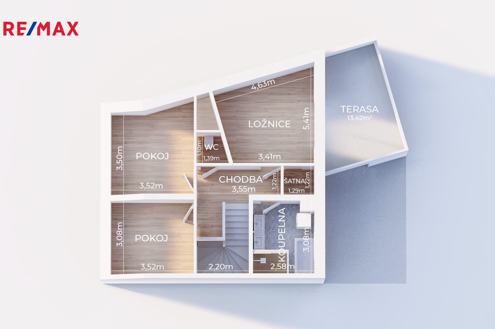 • patro: dva dětské pokoje, hlavní ložnice s vlastní šatnou a vstupem na terasu, koupelna s vanou i sprchovým koutem, samostatné WC