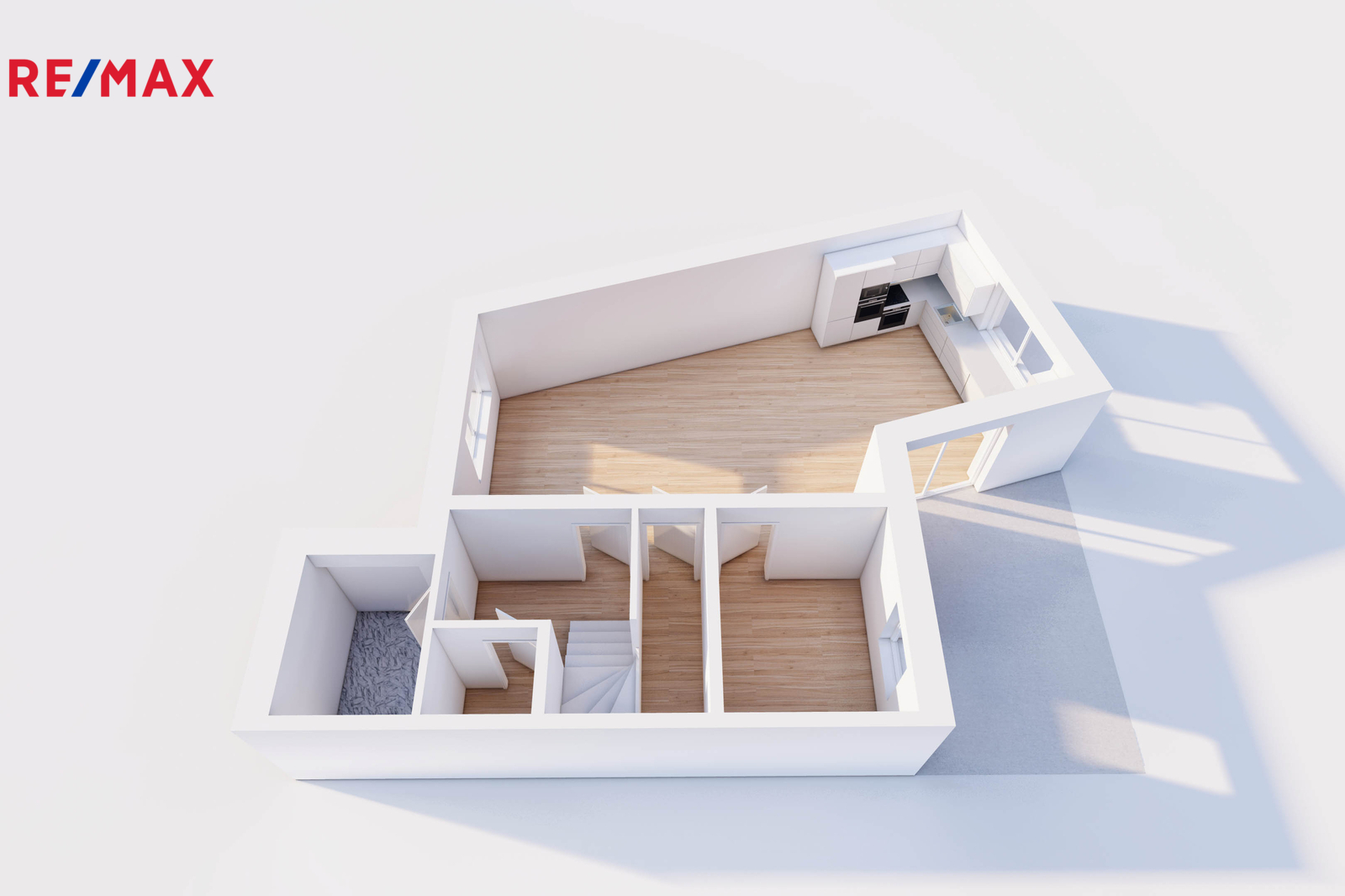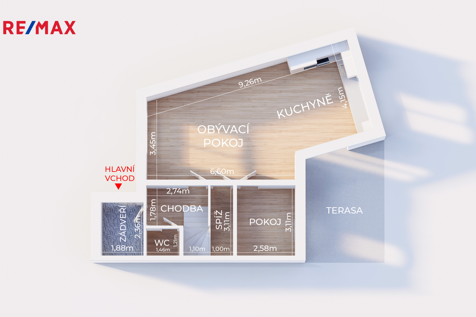 • přízemí: obývací pokoj s kuchyní a vstupem na zahradu, spíž, pokoj pro hosty, vstupní chodba, samostatné WC