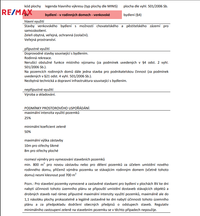 Pozemek nelze dál dělit, max výška budovy 10 m, a lze zde postavit rodinný dům o max. 2 bytových jednotkách