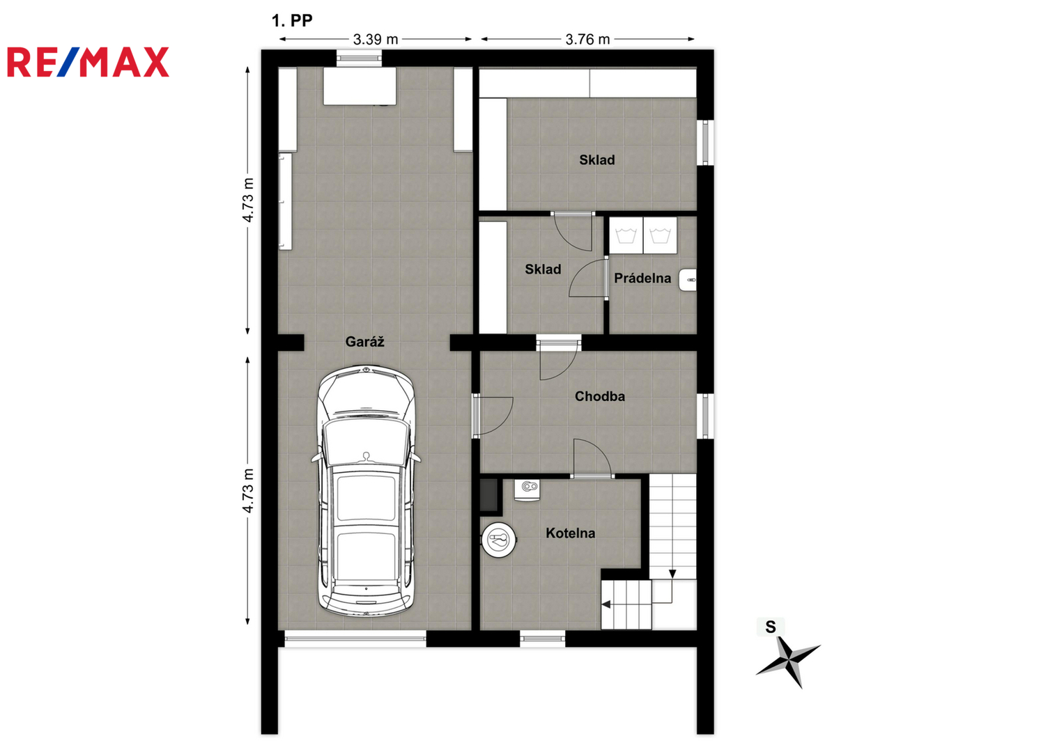 V suterénu je umístěna garáž, prádelna, sklady a technická místnost, kde je umístěn plynový kotel pro vytápění a elektrický kotel pro ohřev vody.