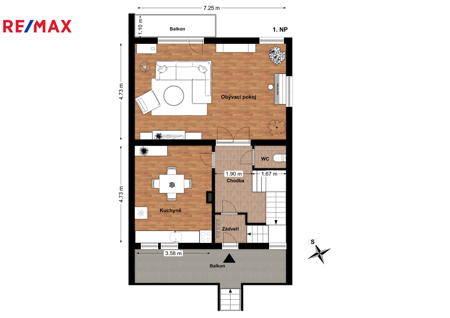 V 1. NP se nachází zádveří, vstupní hala vedoucí do 2. NP, kuchyň, obývací pokoj s krbem.