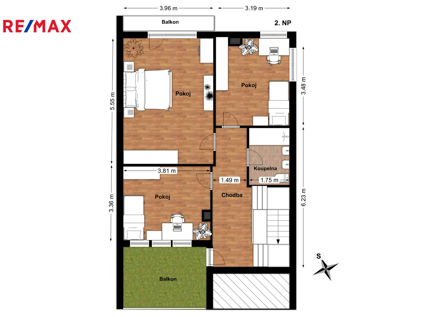 Ve 2. NP se nachází tři ložnice, balkon s výhledem na zahradu, terasa s výhledem do ulice a koupelna s WC.