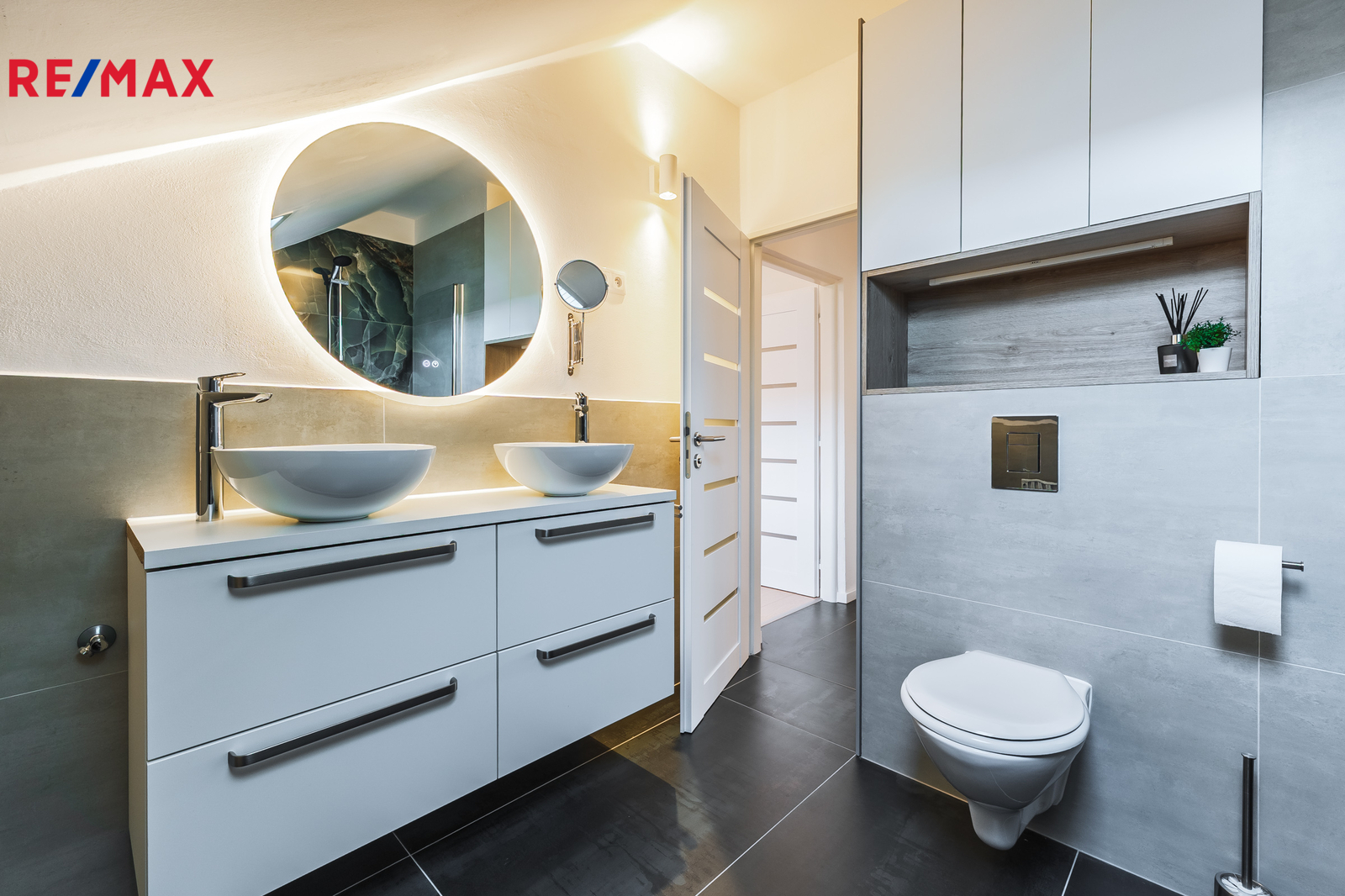 -koupelna s vanou, dvěma umyvadly a toaletou