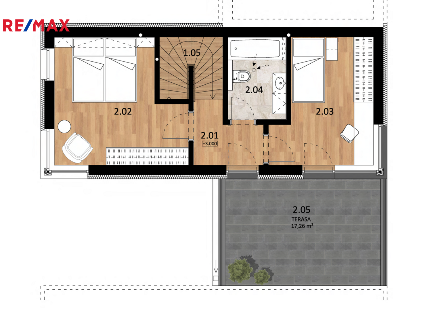 V patře jsou dva samostatné neprůchozí pokoje (14,32 m² a 11,2 m²), koupelna s WC (4,87 m²) a velká terasa o výměře 17,26 m².