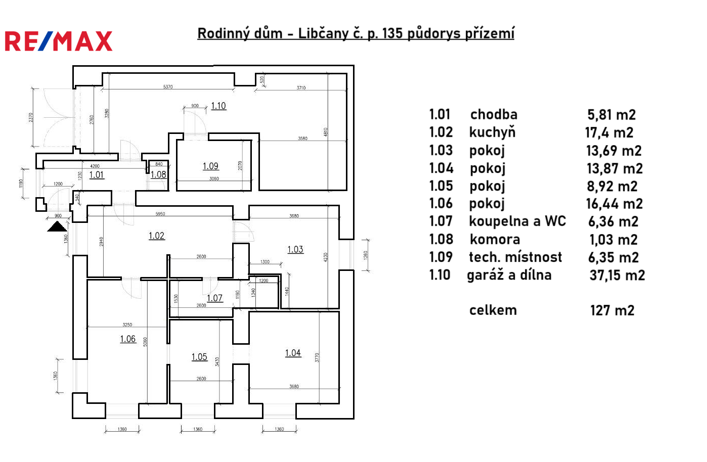 Dispozice domu je 4+1, v přízemí se nachází kuchyň 17,4m2, čtyři pokoje o velikosti 13,69, 13,87, 8,92 a 16,44m2. Dále se v přízemí nachází chodba o velikosti 5,81m2, koupelna a WC 6.36m2, komora 1,03m2, technická místnost 6,35m2 a garáž s dílnou 37,15m2. Půdní prostor je neobydlený avšak lze vybudovat další možné pokoje a rozšířit tak obydlí o více místa. Garáž je průjezdná z obou stran.