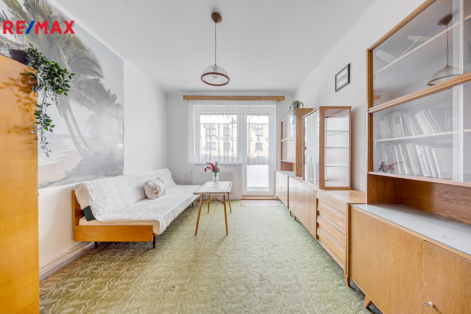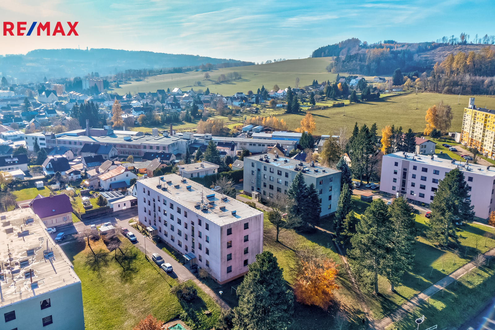 Bytový dům je zateplen, má plastová okna a nové vstupní dveře. Před domem je parkoviště a dětské hřiště — ideální pro rodiny.