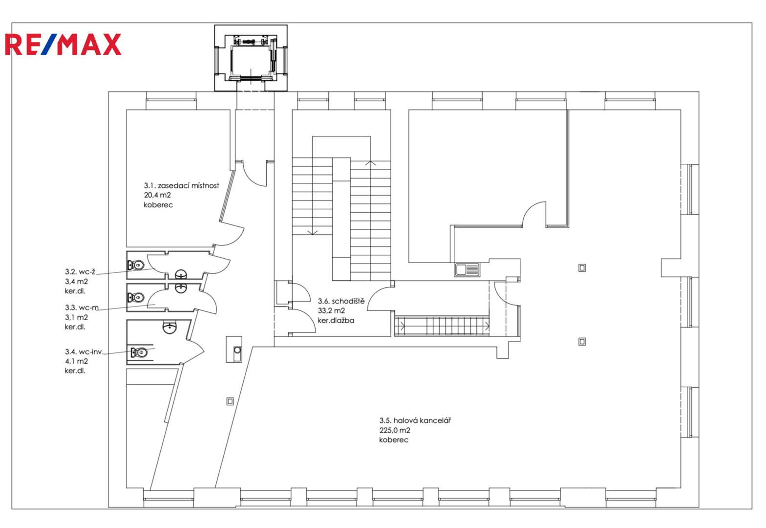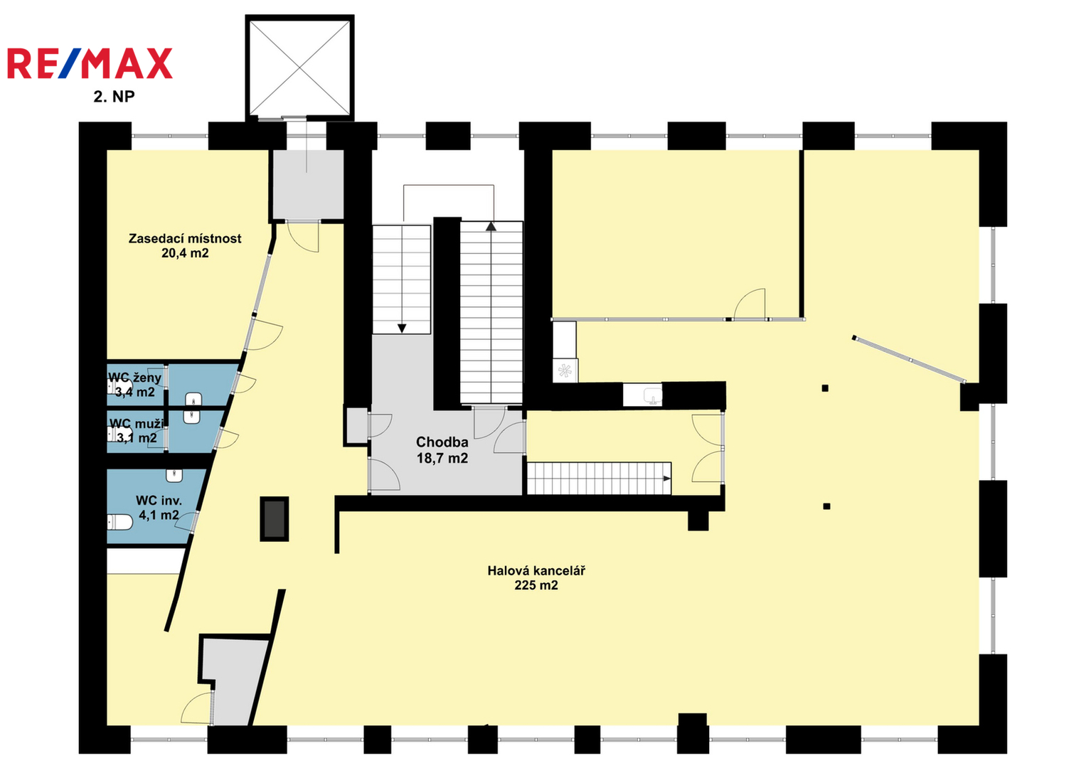 Dispozice horního patra: 2 uzavřené kanceláře, jednací místnost, otevřená kancelář (openspace) pro více osob, sociální zázemí (2x WC, úklidová místnost) kuchyňka.