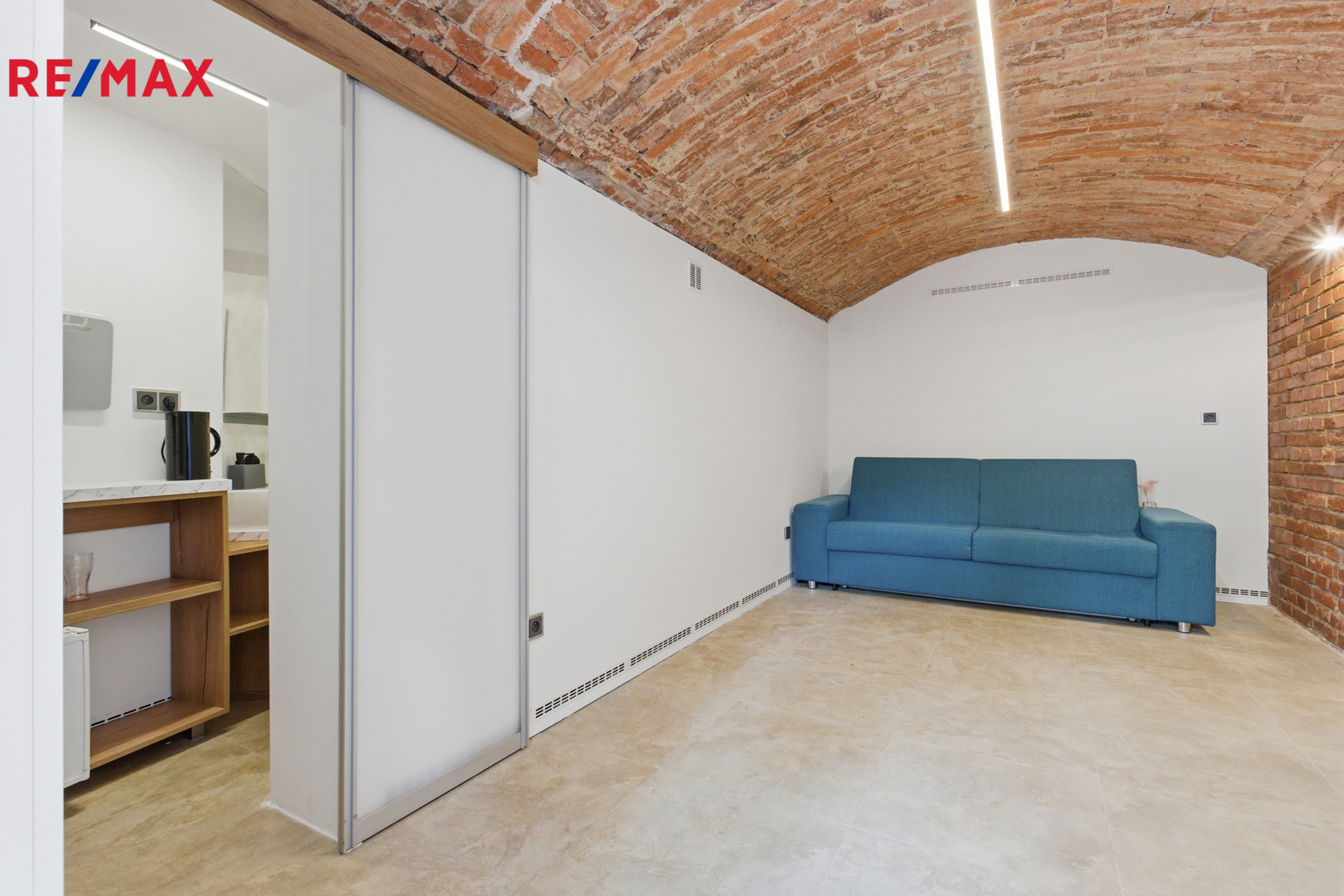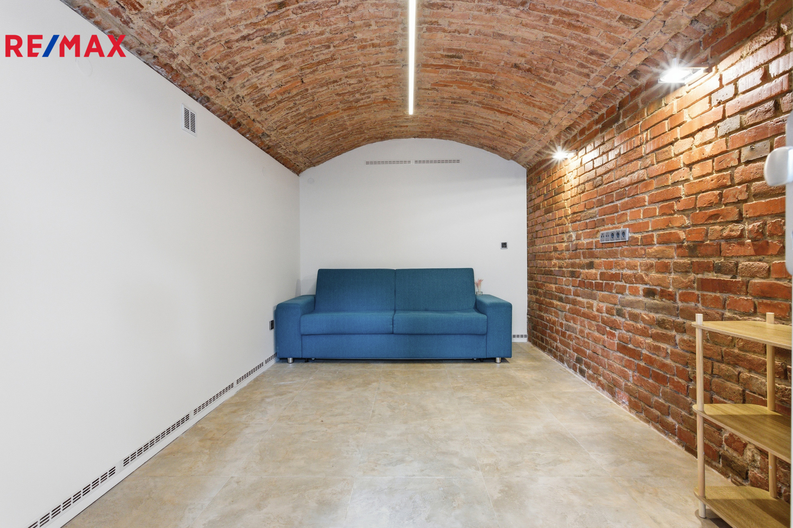 Dominantou interiéru je působivý cihlový klenbový strop, velkoformátová dlažba a moderní minimalistické pojetí, které vytváří reprezentativní prostředí vhodné pro kancelář, ateliér, pracovní studio nebo tiché studentské bydlení. Dispozici tvoří hlavní místnost a vlastní sociální zázemí se sprchovým koutem a toaletou. K dispozici je také menší koutek vhodný pro přípravu jednoduchého občerstvení. Vytápění je zajištěno elektrickým podlahovým topením.