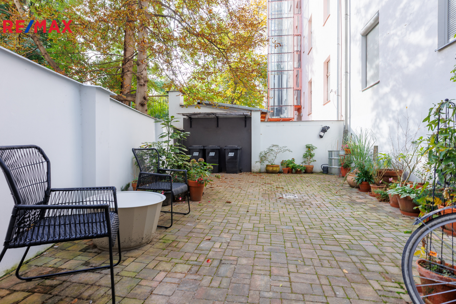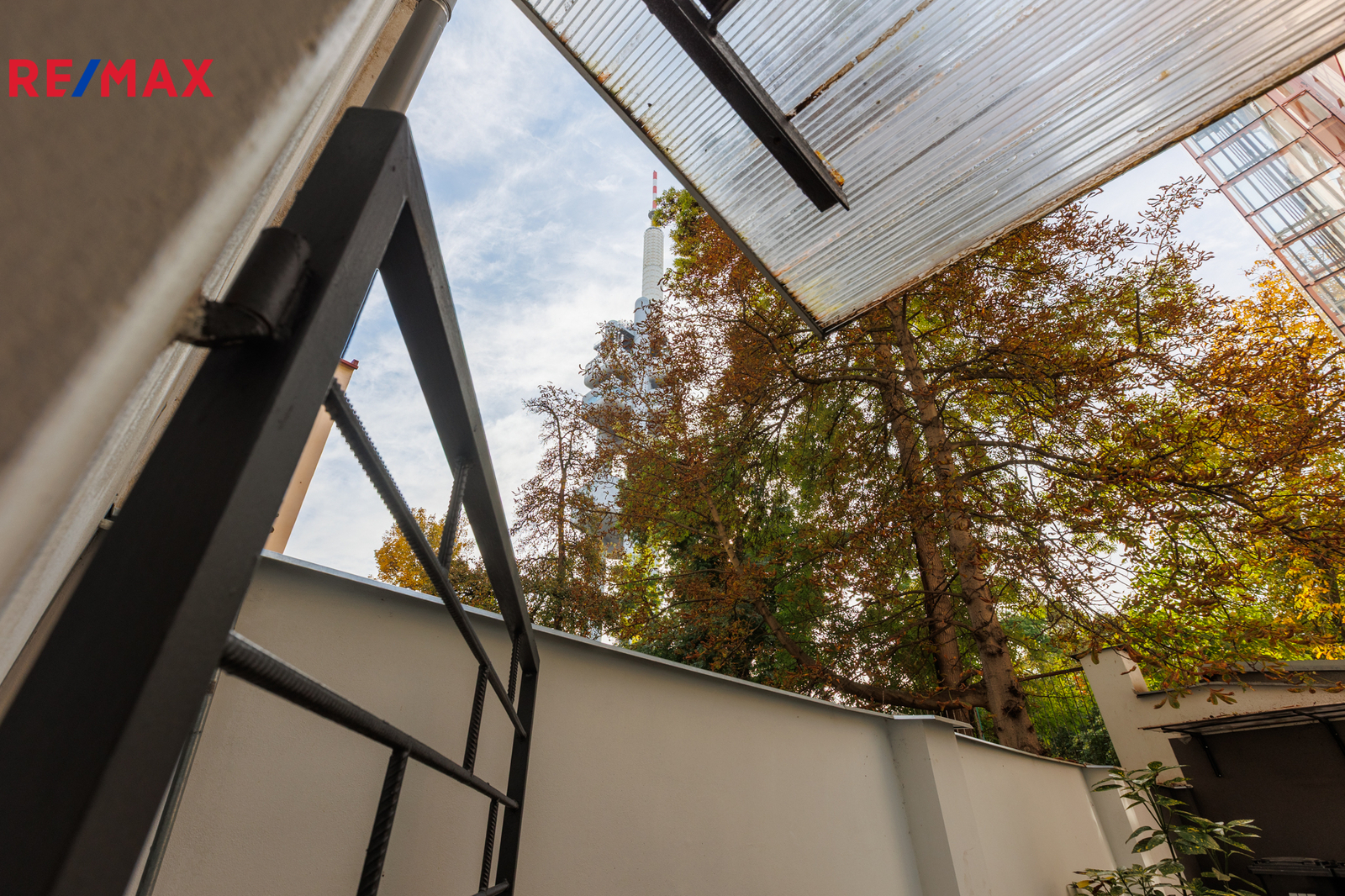 Součástí nájmu je sklep o velikosti 4,4 m², umístěný v blízkosti jednotky. Ve sklepě je přívod vody, odpad pro připojení pračky, elektrická zásuvka a osvětlení. Nájemce může dále využívat venkovní posezení ve vnitrobloku, odkud je částečný výhled na Žižkovskou televizní věž.